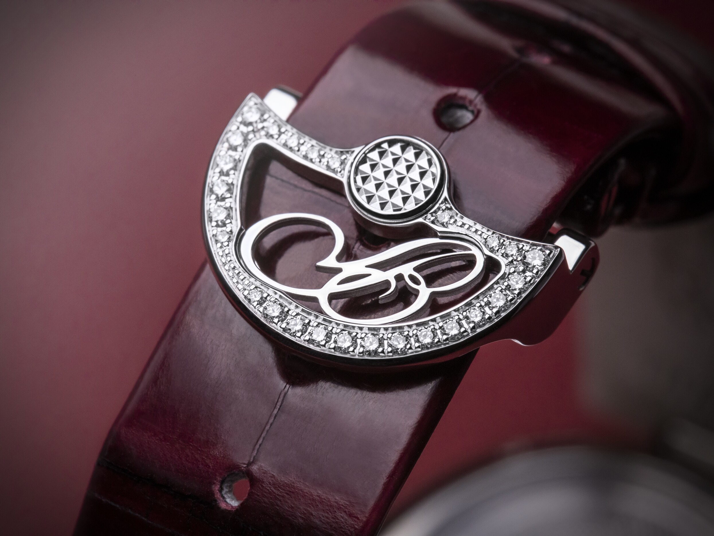 18白K金材質、原鑲鑽錶(錶殼鑲嵌117顆鑽石,約0.876克拉、1 顆紅寶石,約0.27克拉、錶扣鑲嵌28顆鑽石,約0.1638克拉、1 顆梨形鑽石,約0.08克拉)、透明錶背