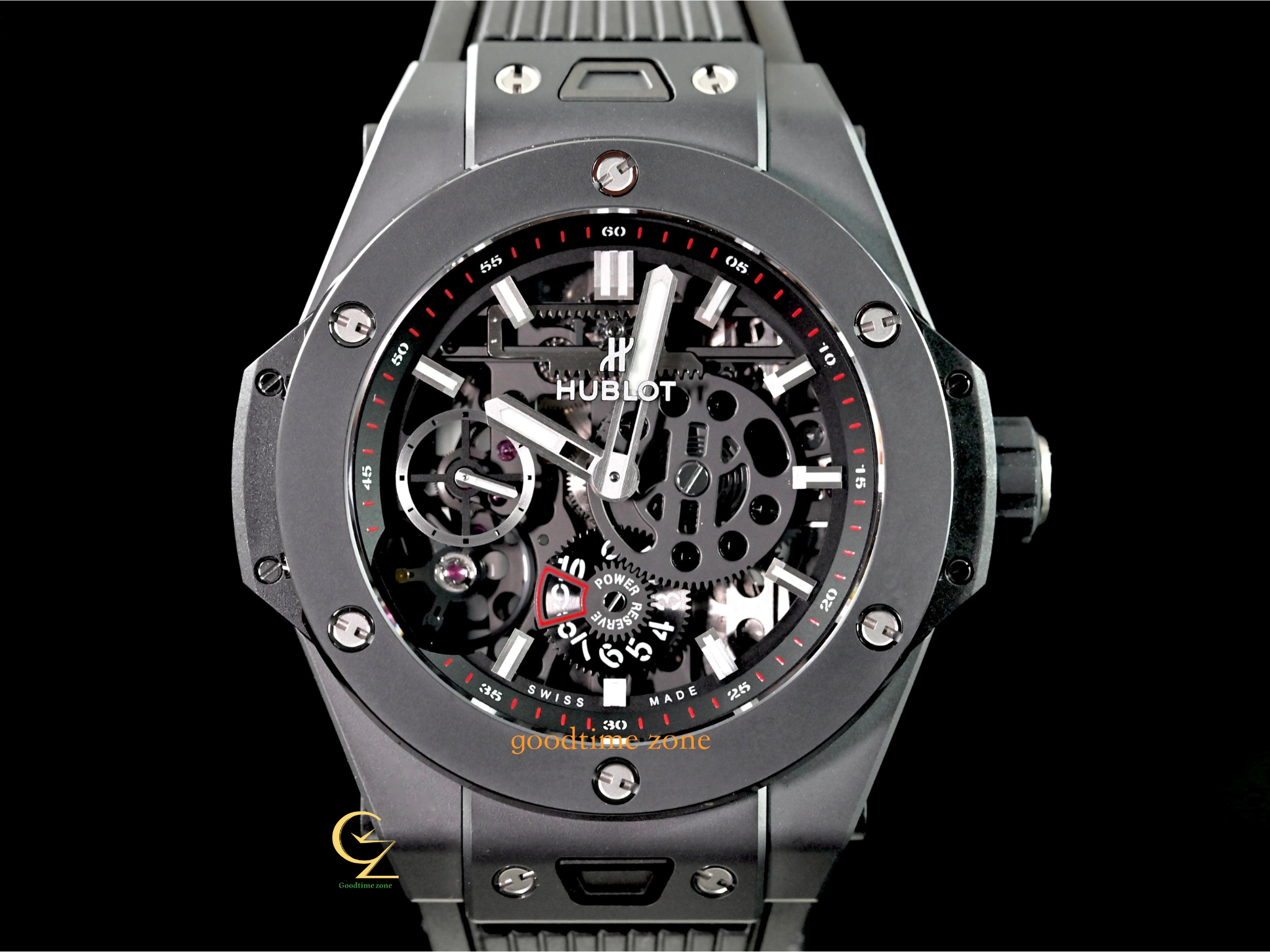 黑色陶瓷材質、鏤空面盤、夜光指針及時標、黑色橡膠錶帶、透明錶背、藍寶石水晶玻璃