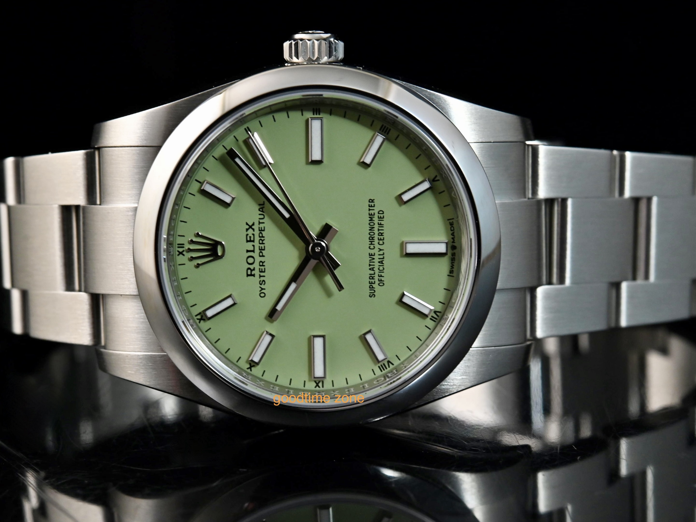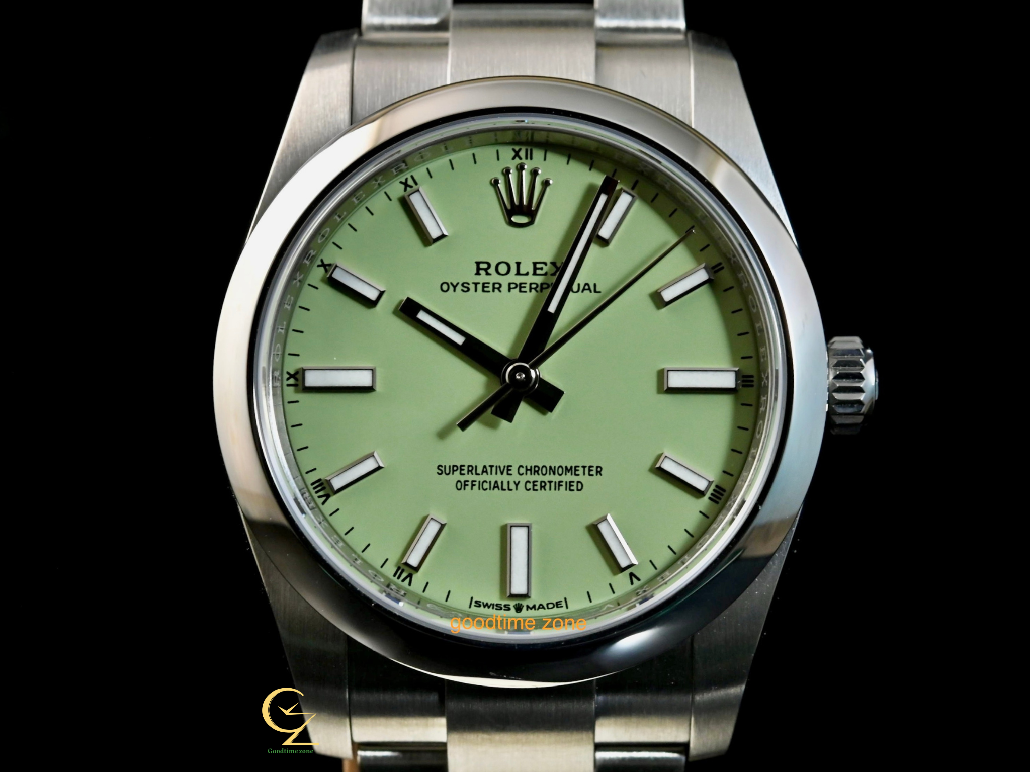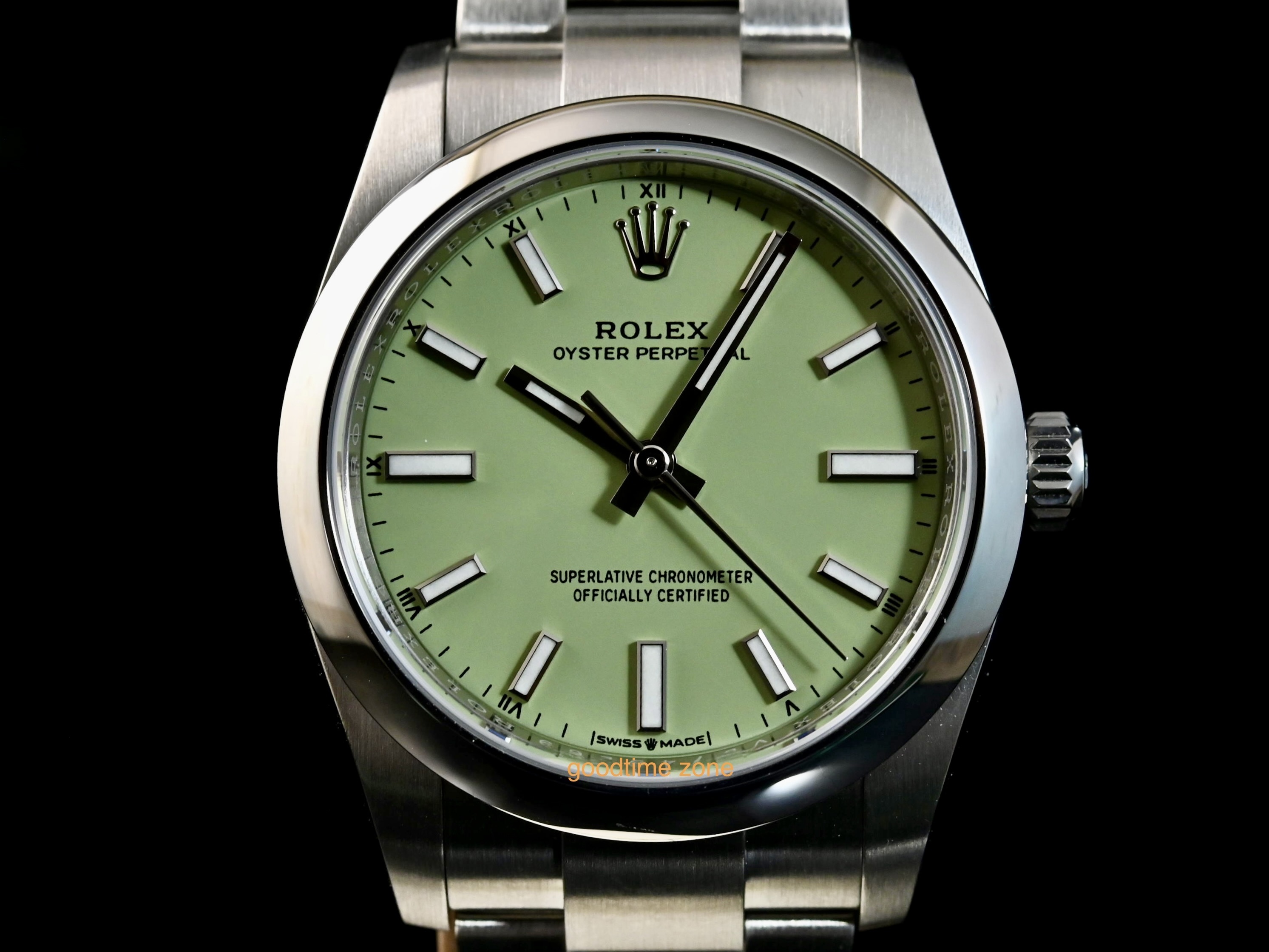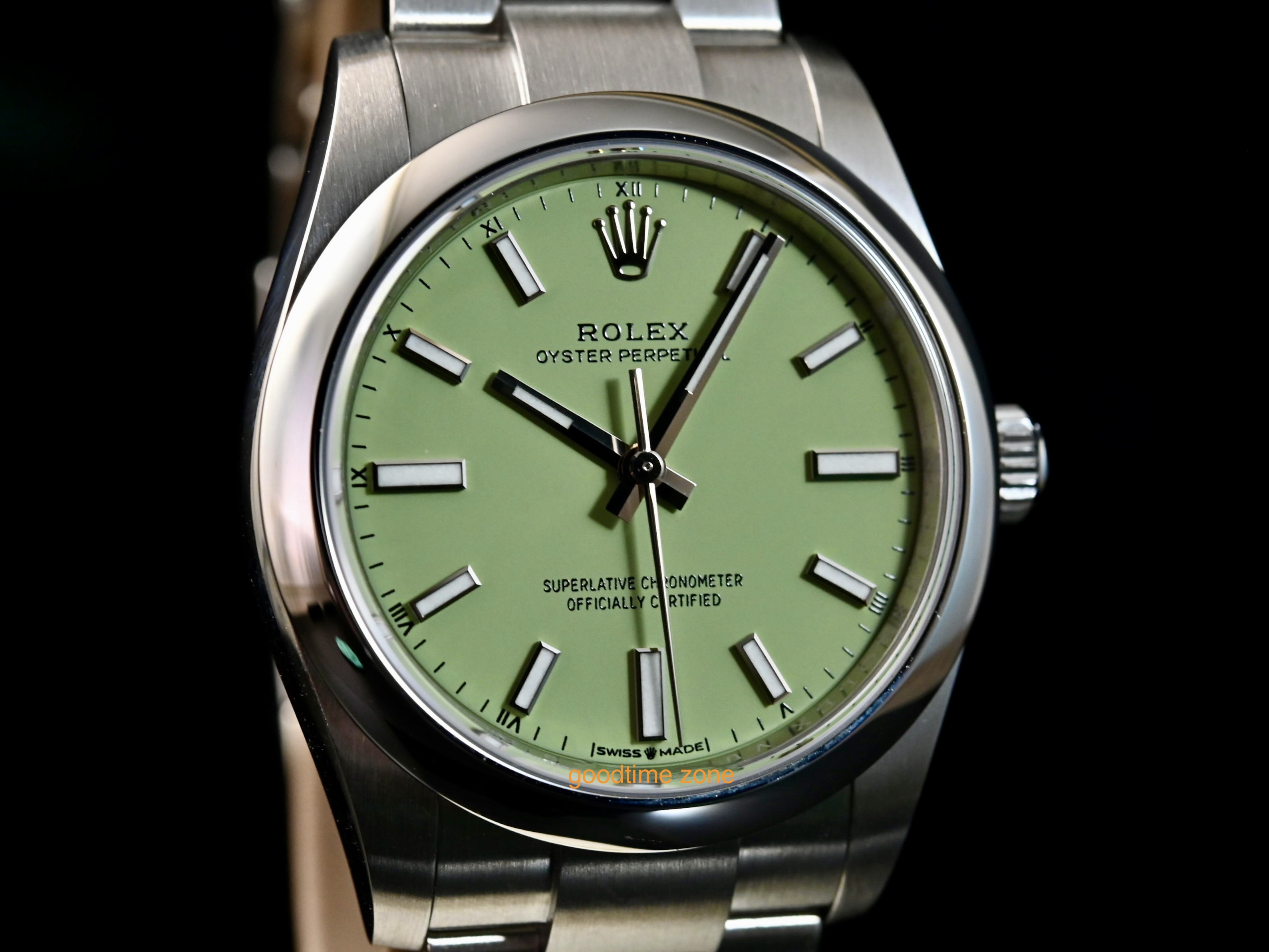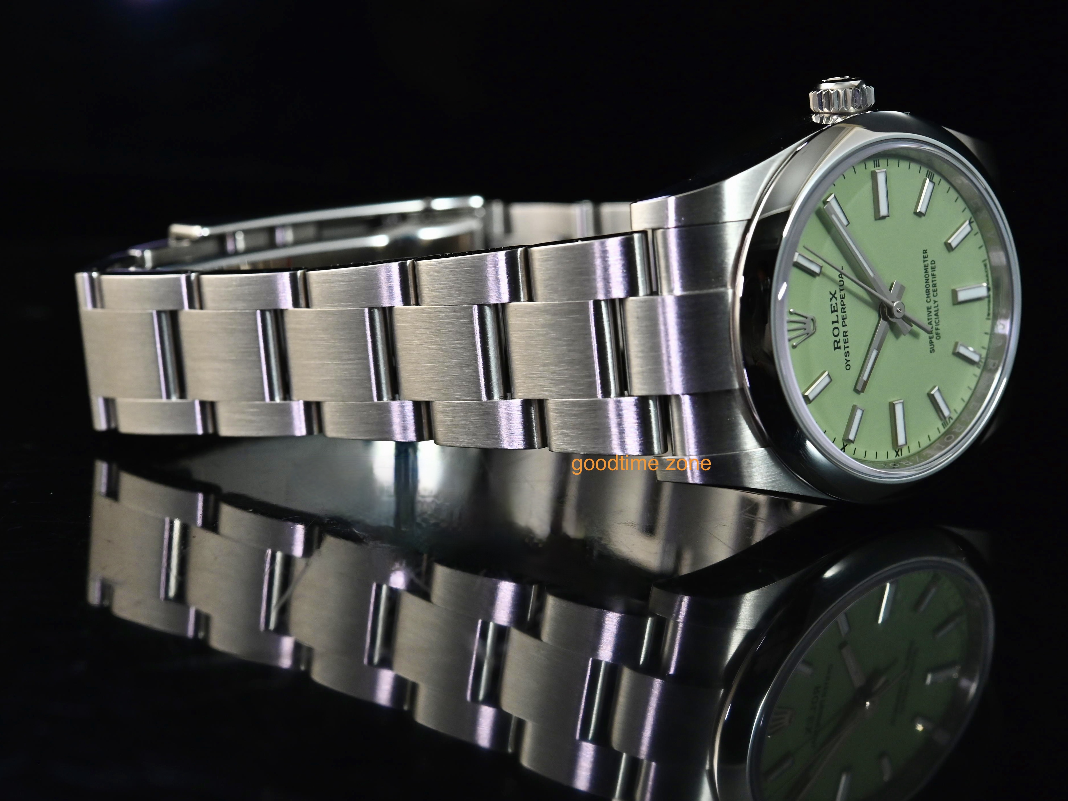 不鏽鋼材質、最新款 Pistachio 開心果綠色面、藍寶石水晶玻璃