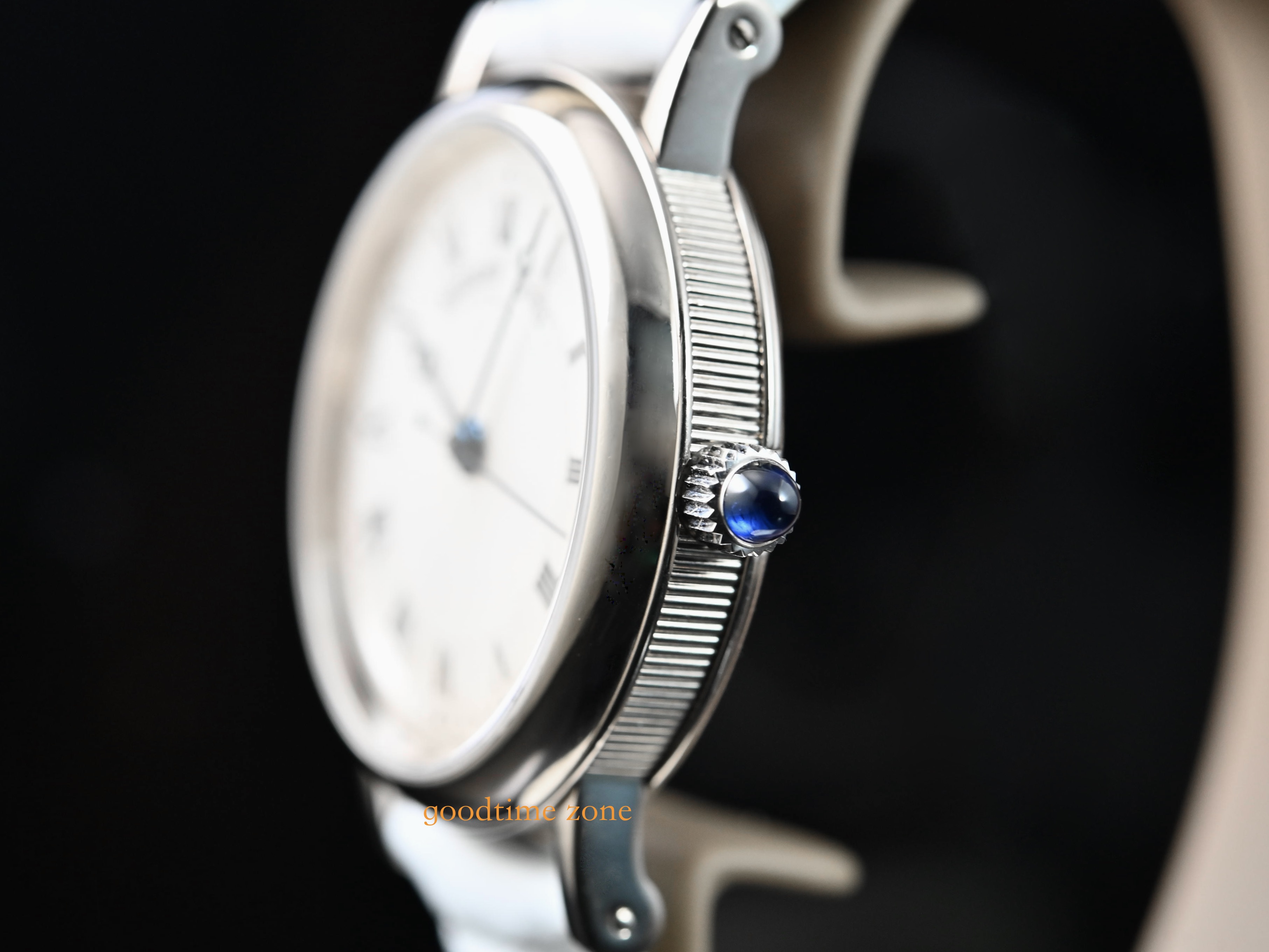 18白K金材質、貝殼面、手工機刻雕花錶盤、1 弧面切割藍寶石(約0.2克拉)