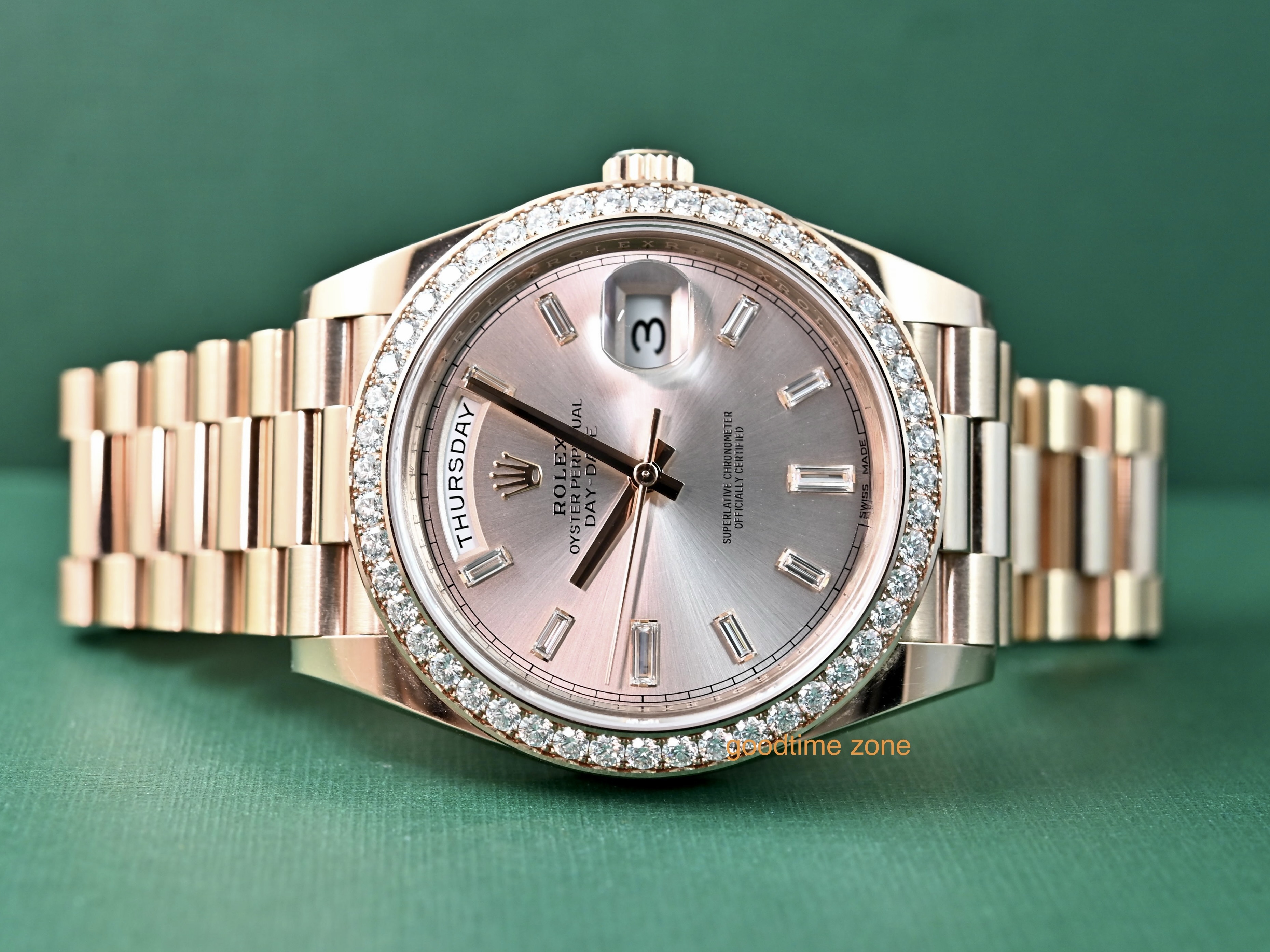 18K永恆玫瑰金材質、原廠鑲嵌大鑽石錶圈及大梯鑽時標、鑲鑽日亮金面盤、玫瑰金指針
