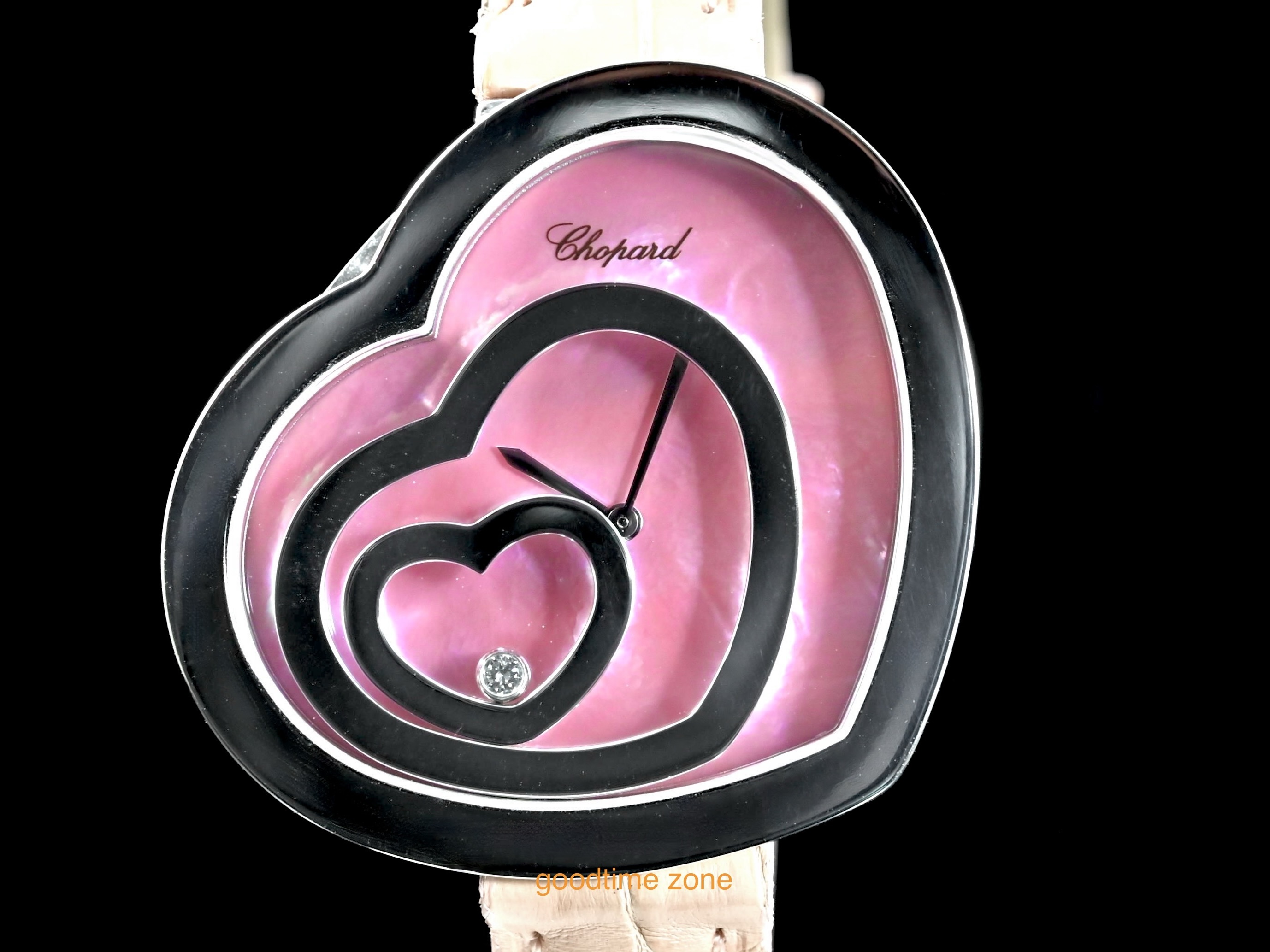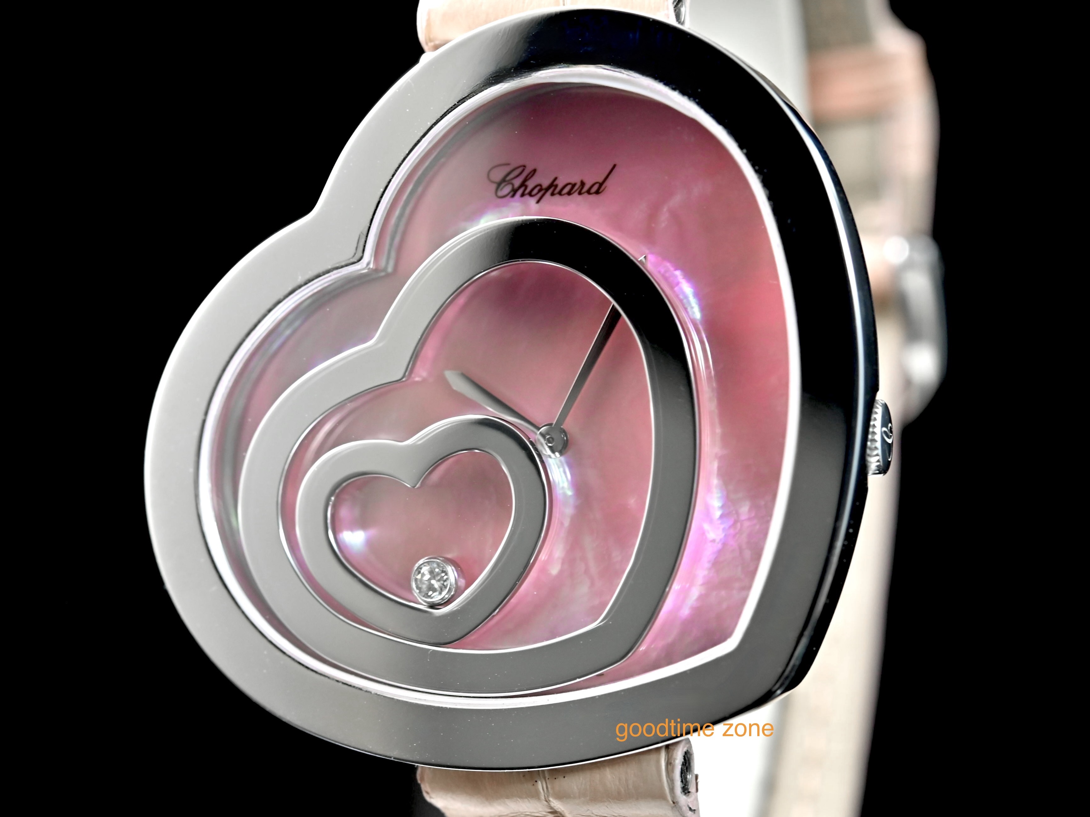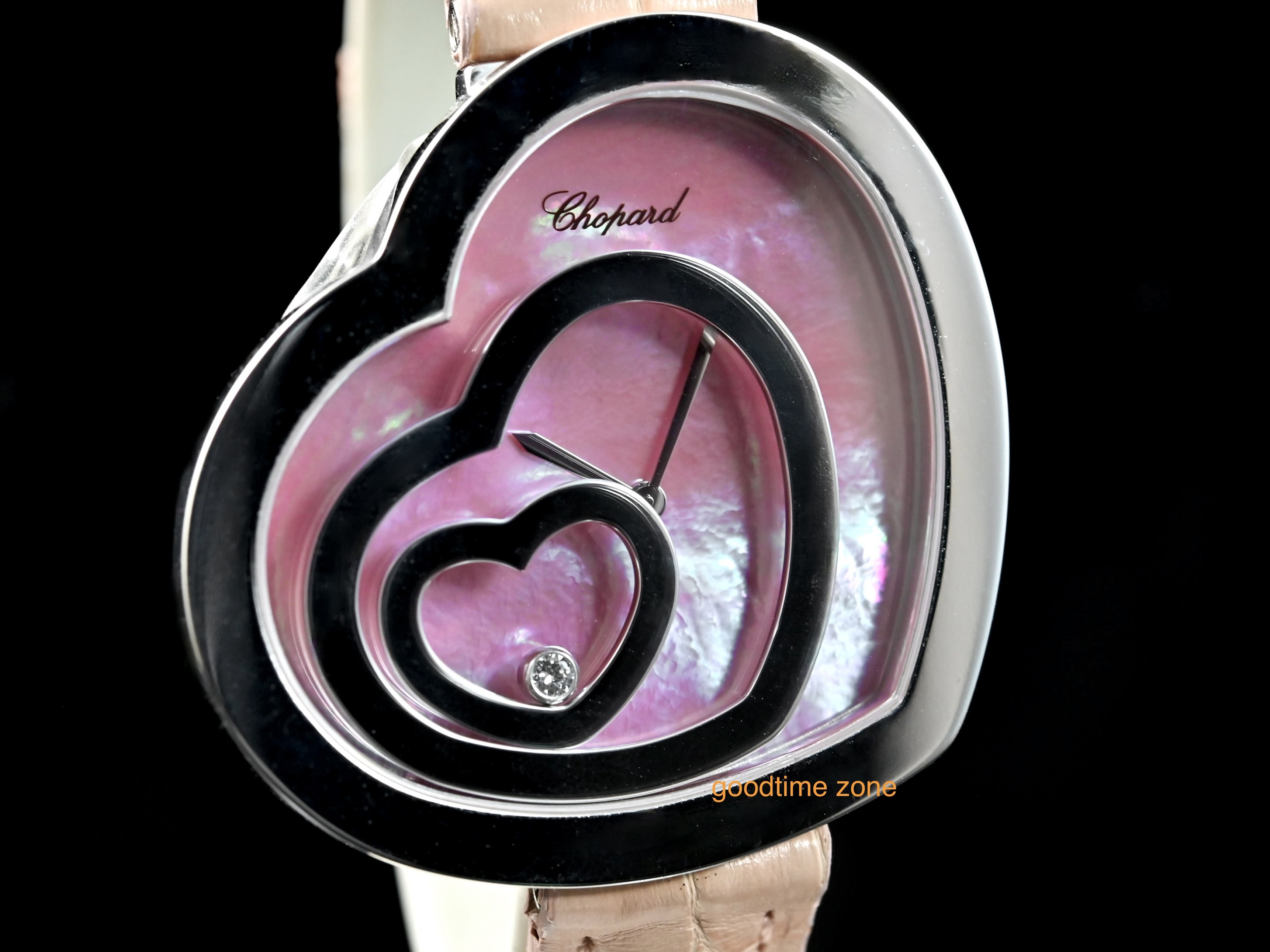 18白K金材質、粉紅貝殼面盤、錶盤內移動式愛心框及1顆圓形跑鑽( 0.05CT )