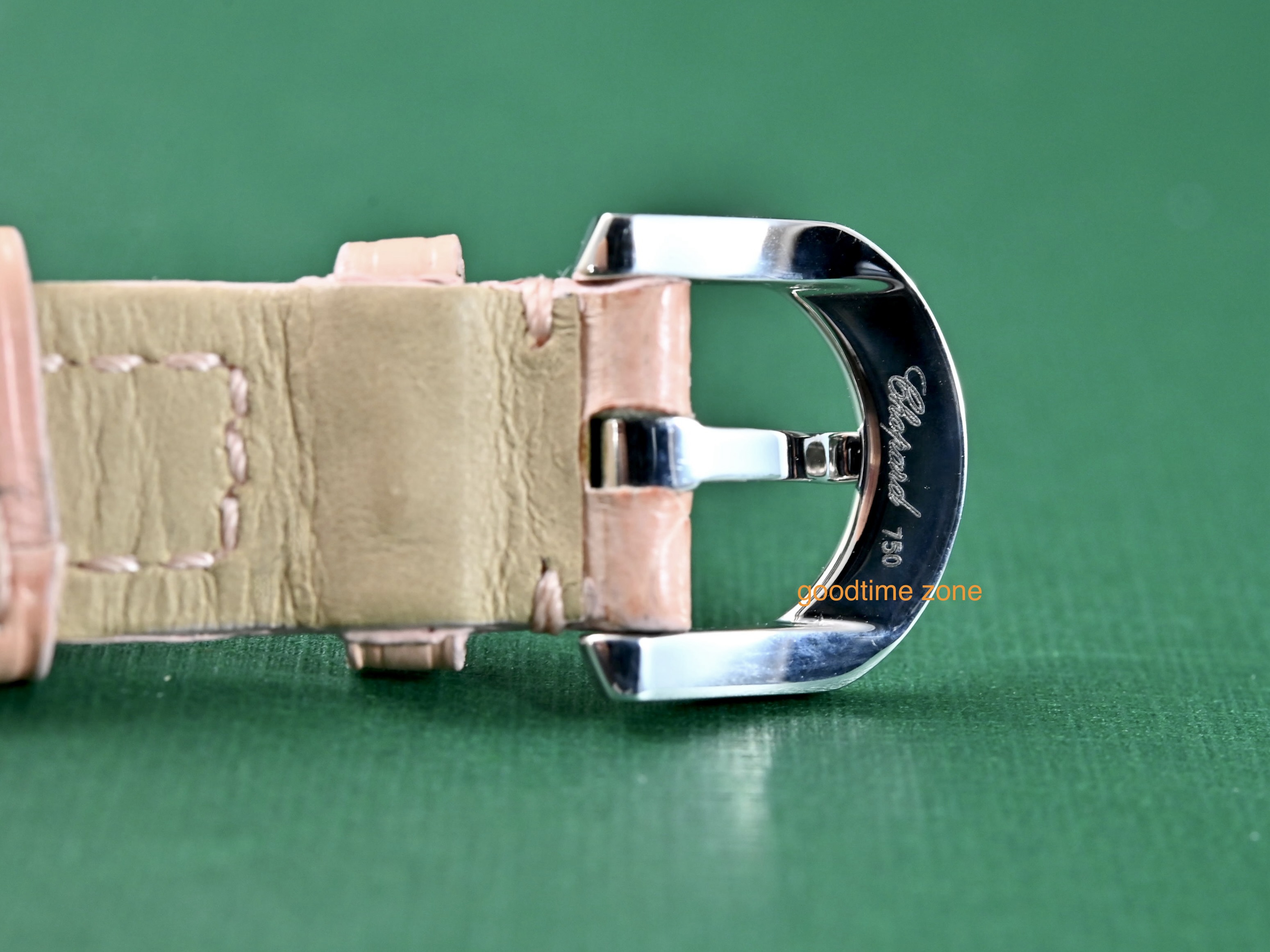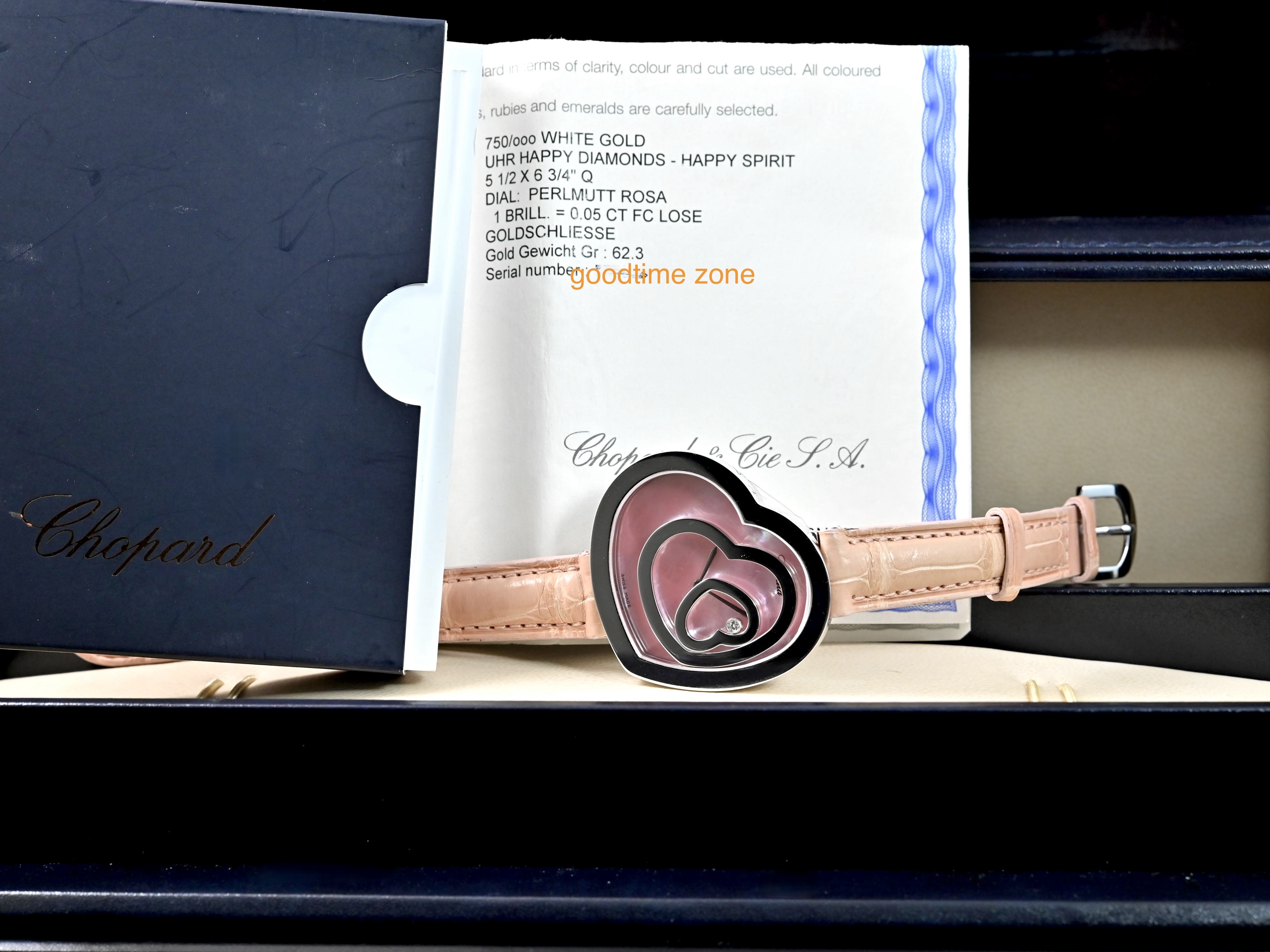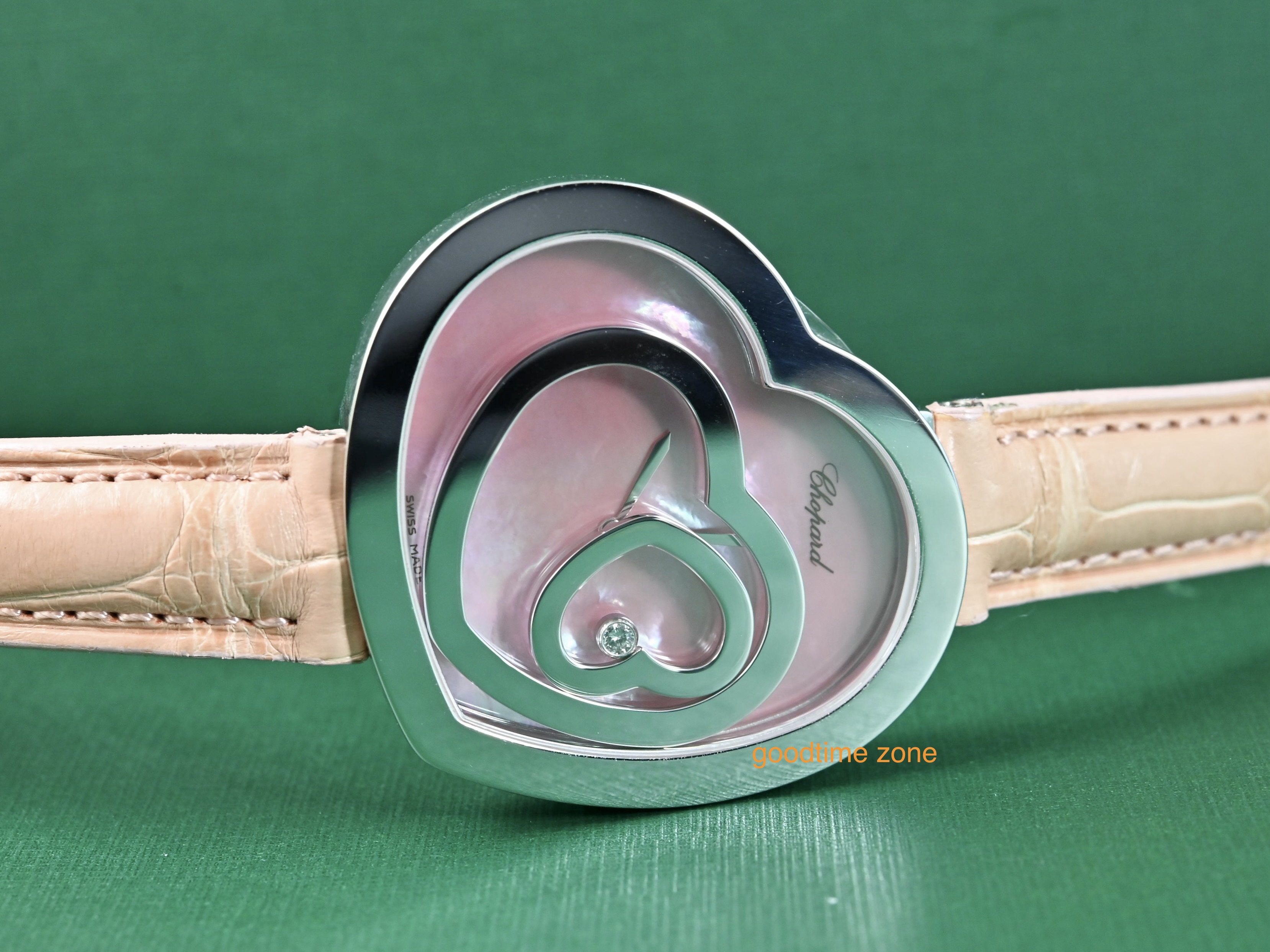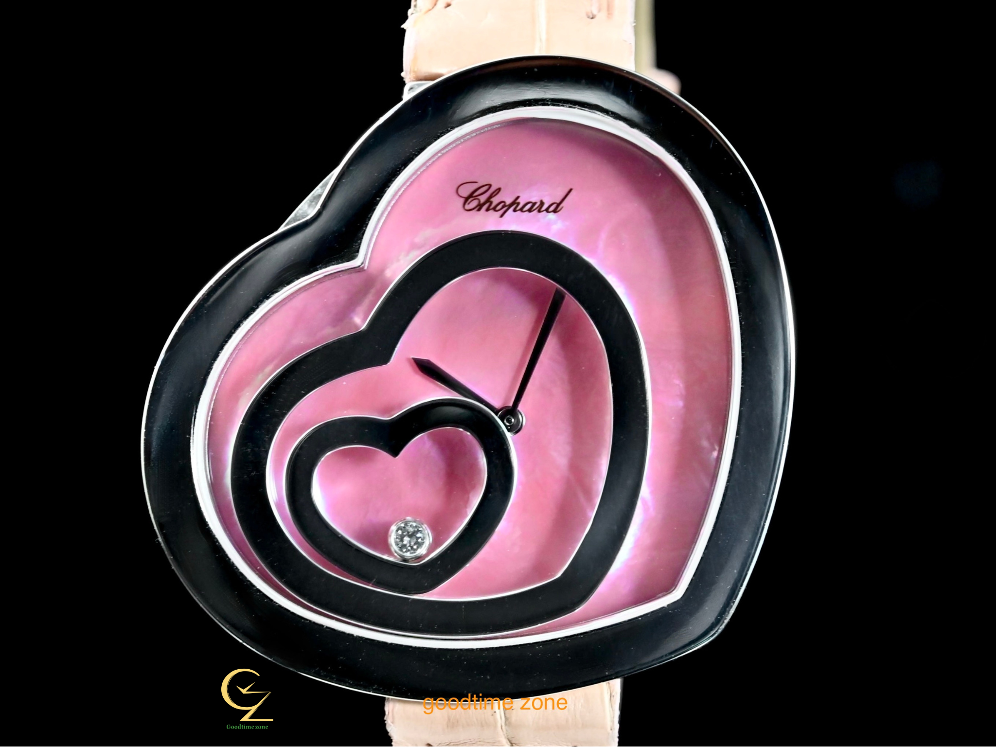 18白K金材質、粉紅貝殼面盤、錶盤內移動式愛心框及1顆圓形跑鑽( 0.05CT )