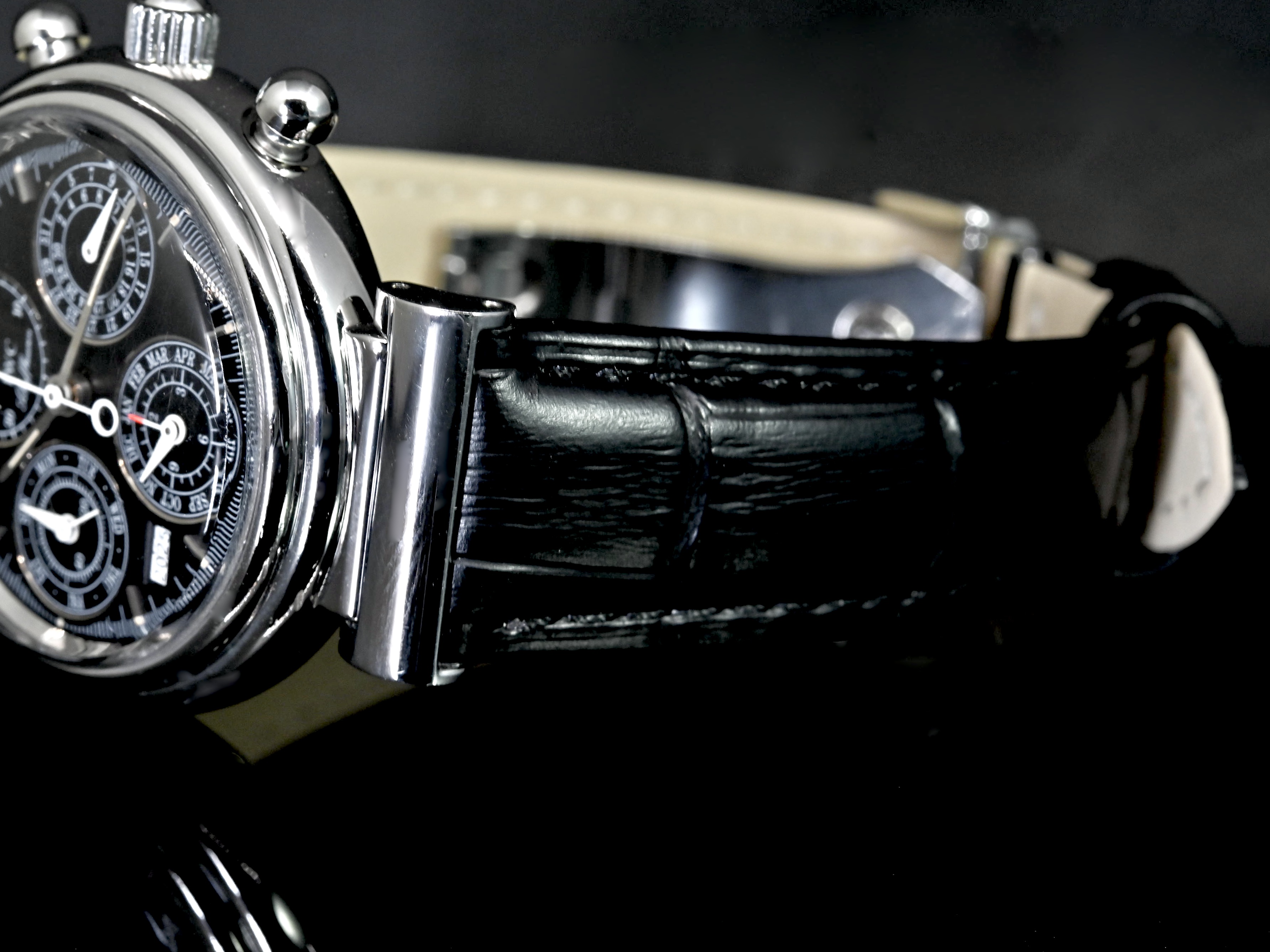Cal.79261自動上鍊機芯、時,分,獨立小秒針指示、計時碼錶功能、萬年曆功能、星期,日期,月份,四位數數字年份顯示、動能儲存44小時、防水30米