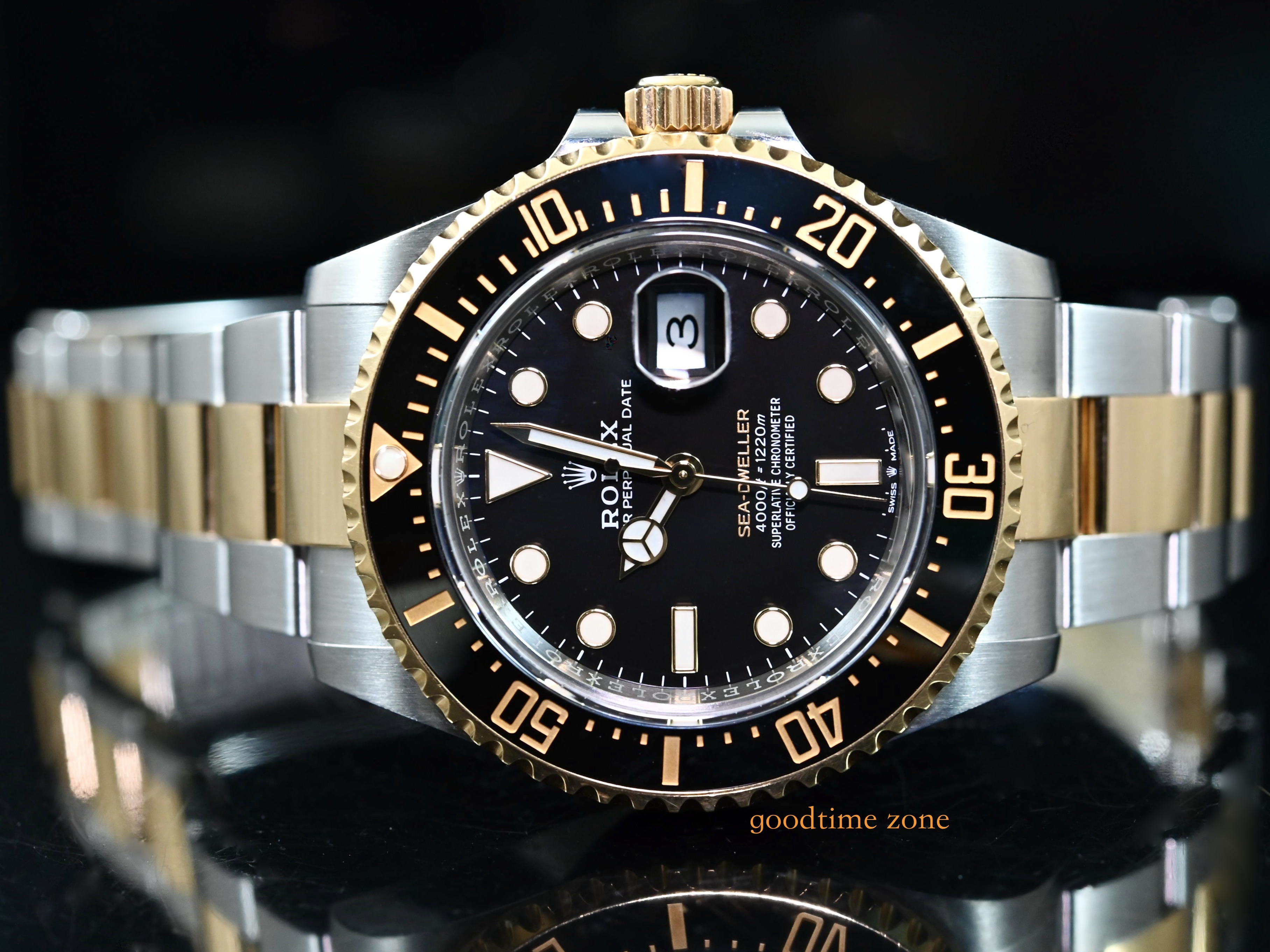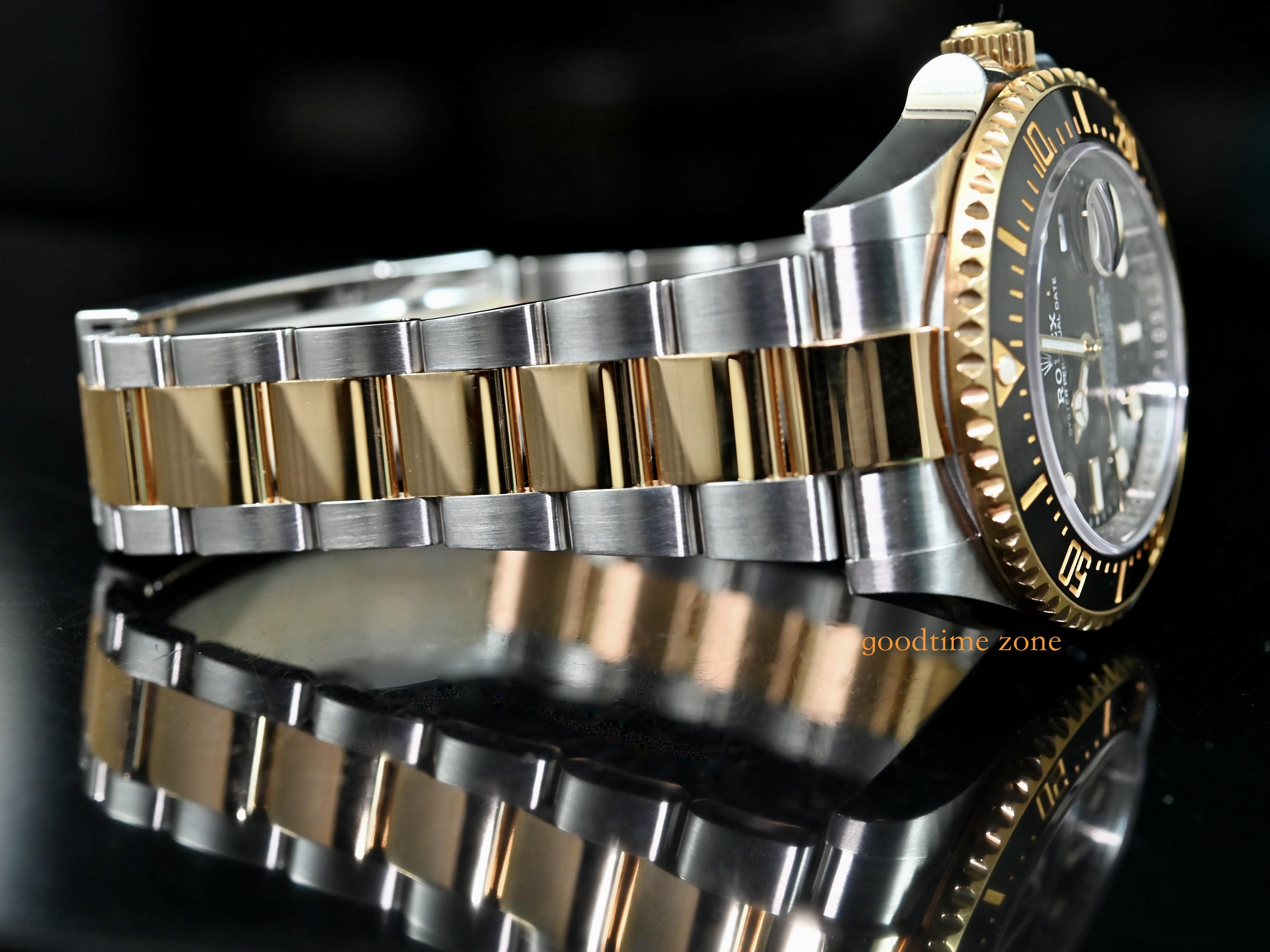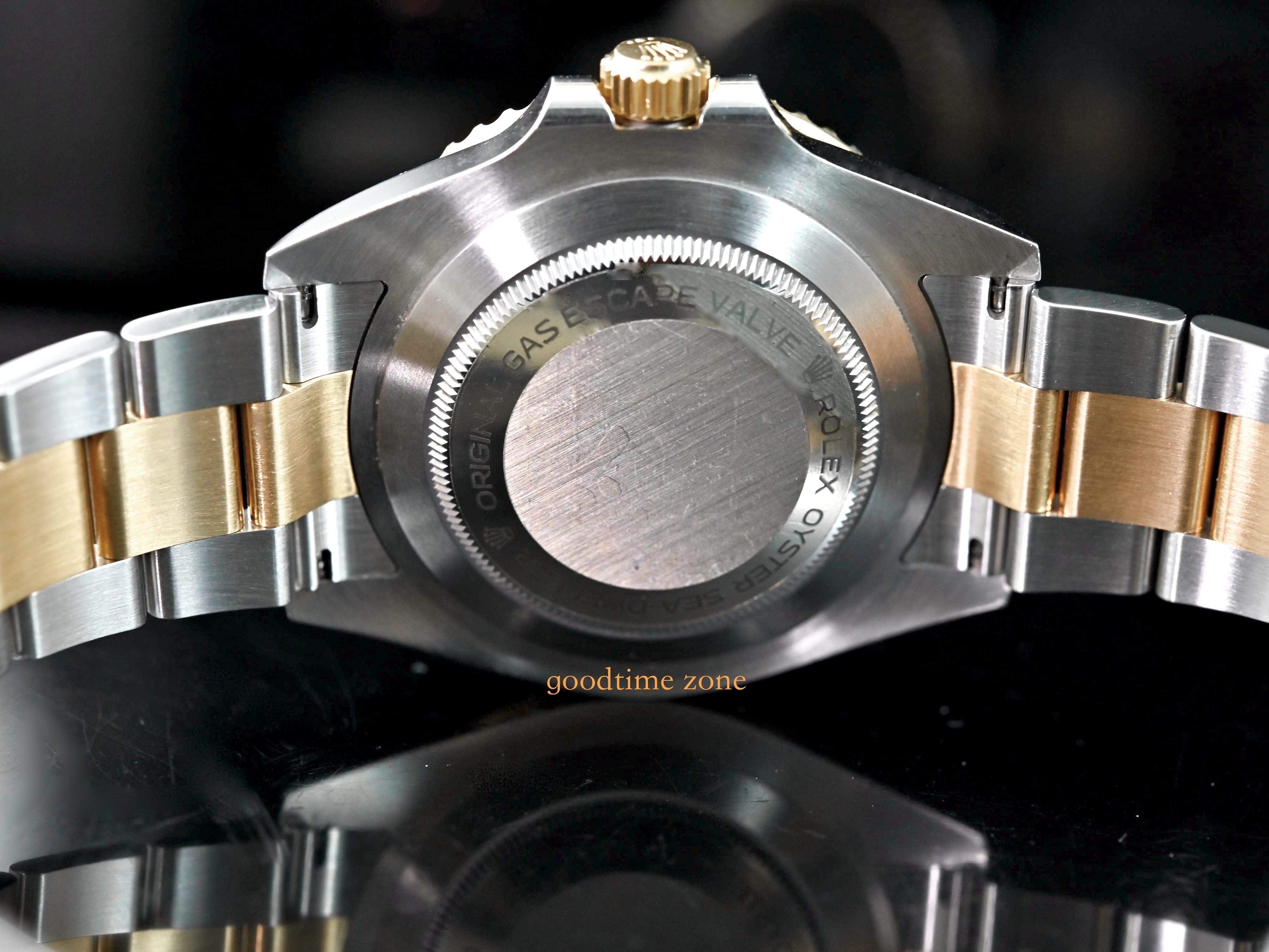 18黃K金+不銹鋼鋼材質、黑色面盤、藍色夜光指針及時標