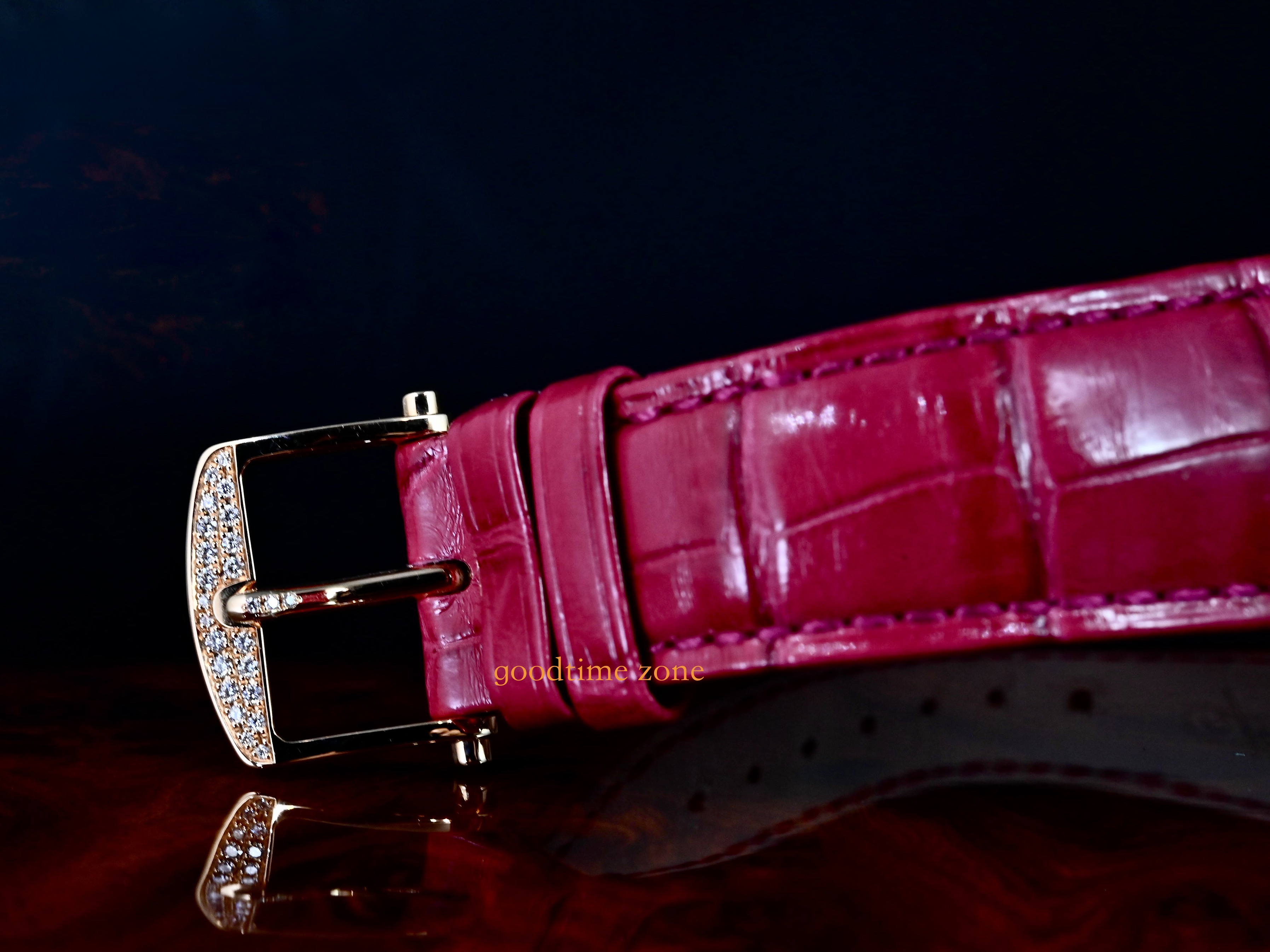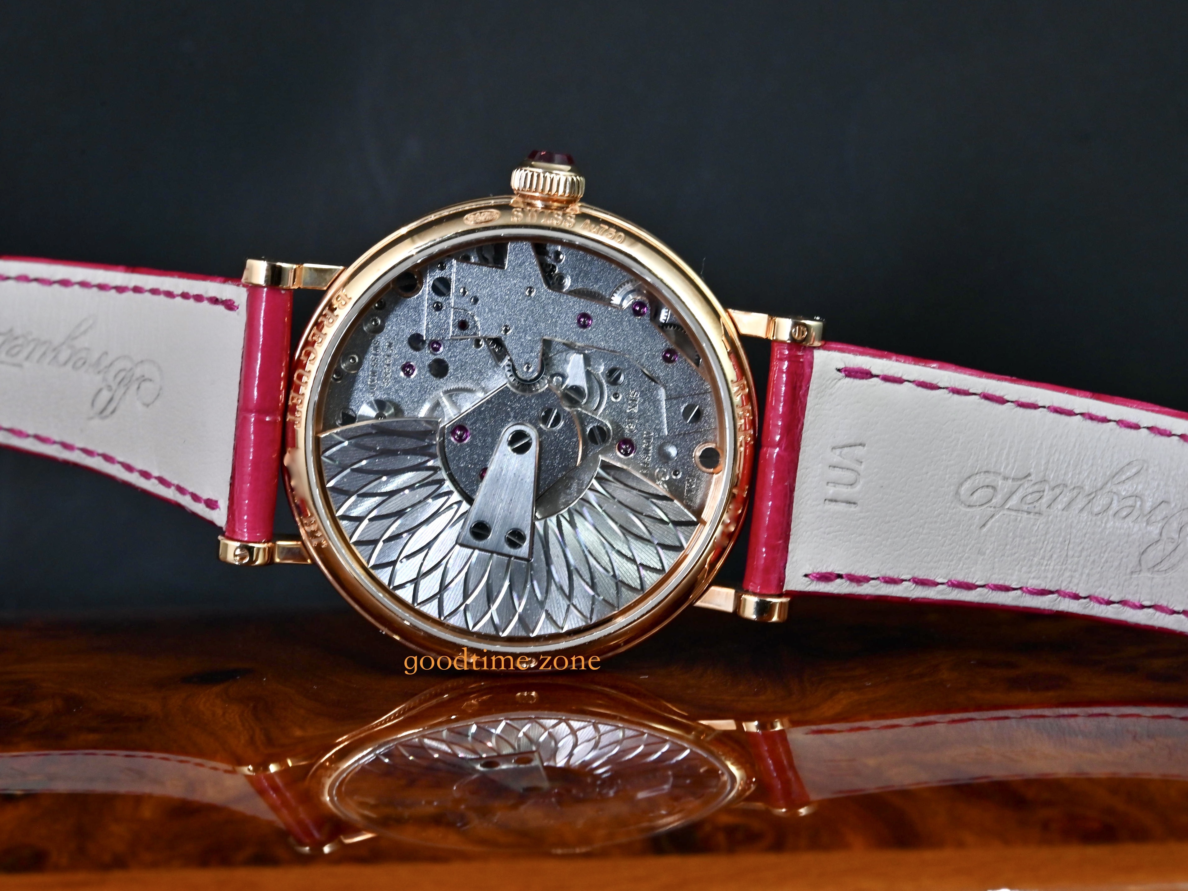18K玫瑰金材質、白色珍珠母鏤空面盤、寶璣鏤空蘋果指針、透明錶背