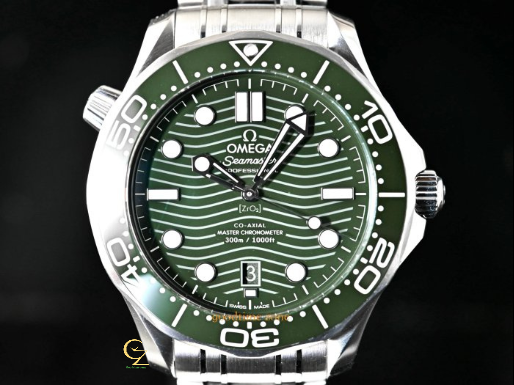不鏽鋼材質、綠色面盤、透明底蓋、藍寶石水晶玻璃