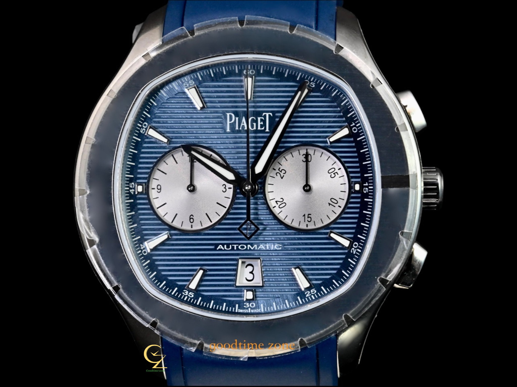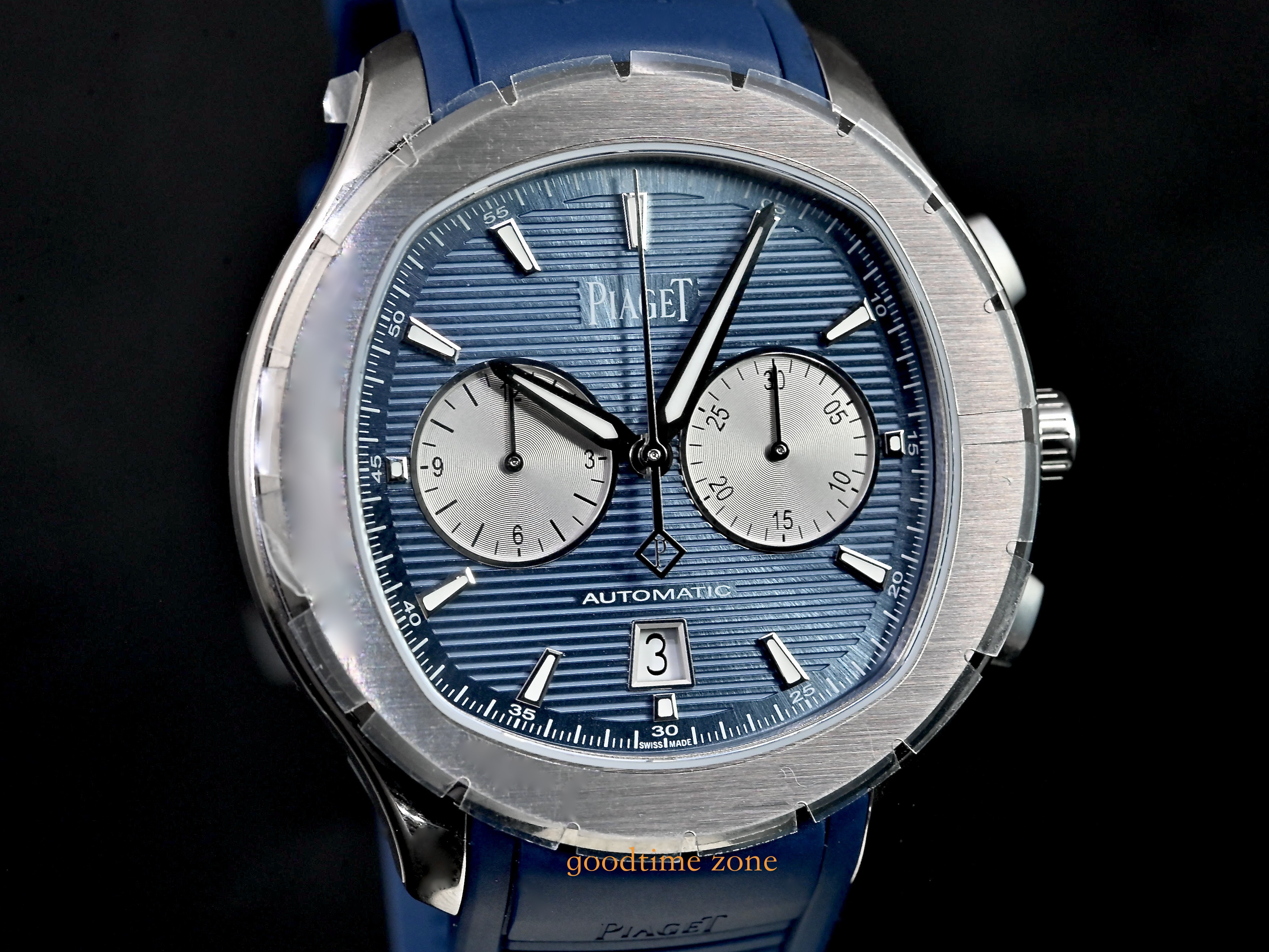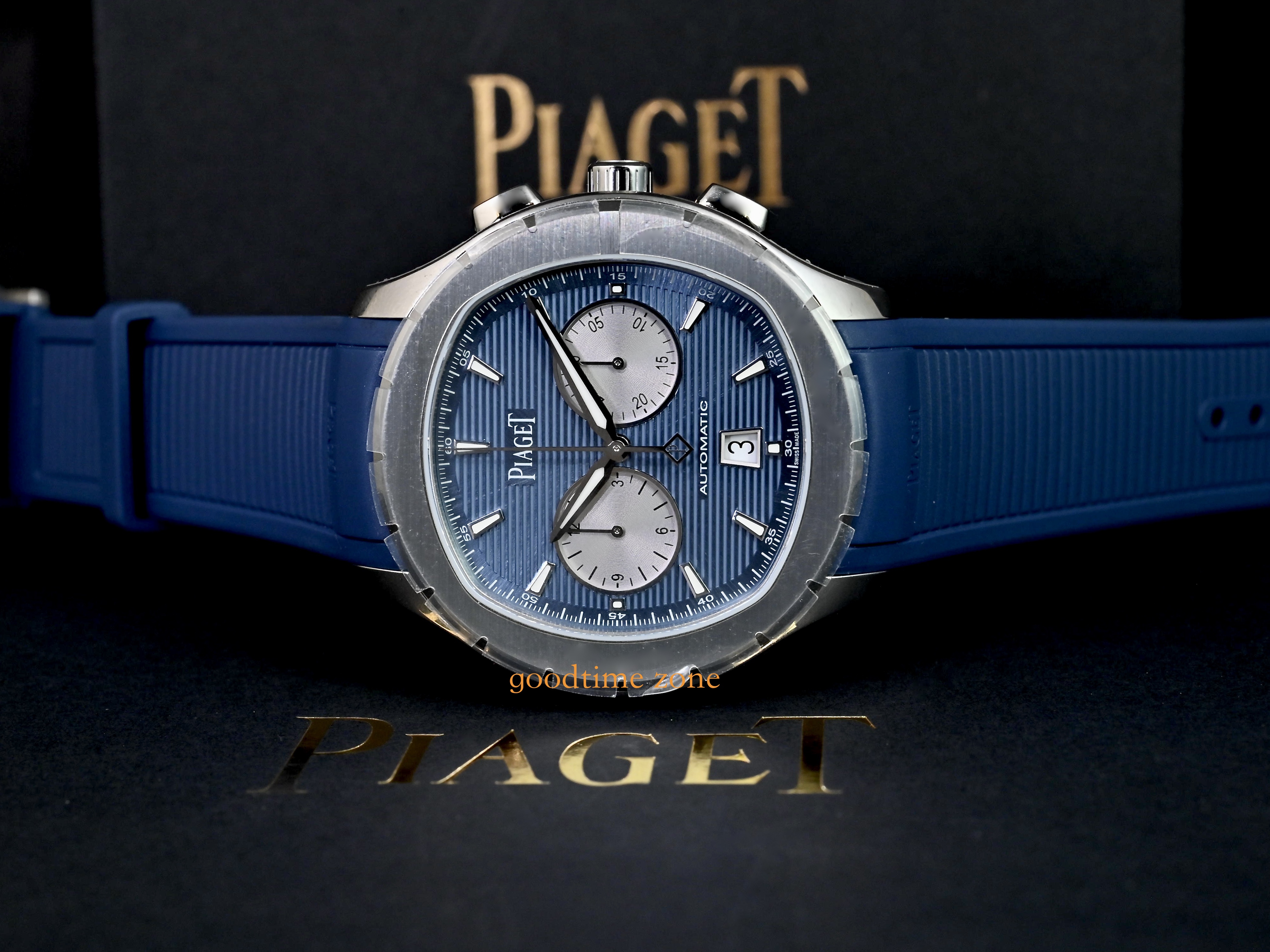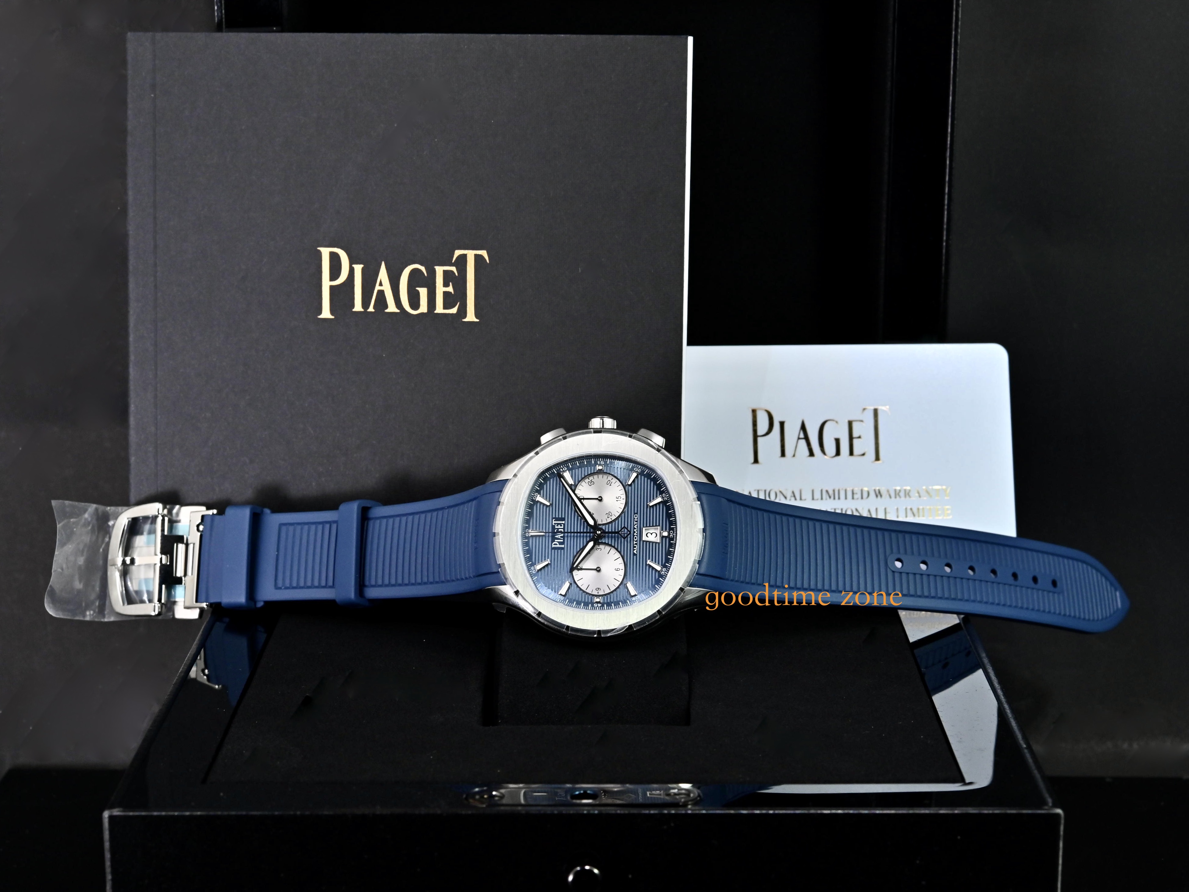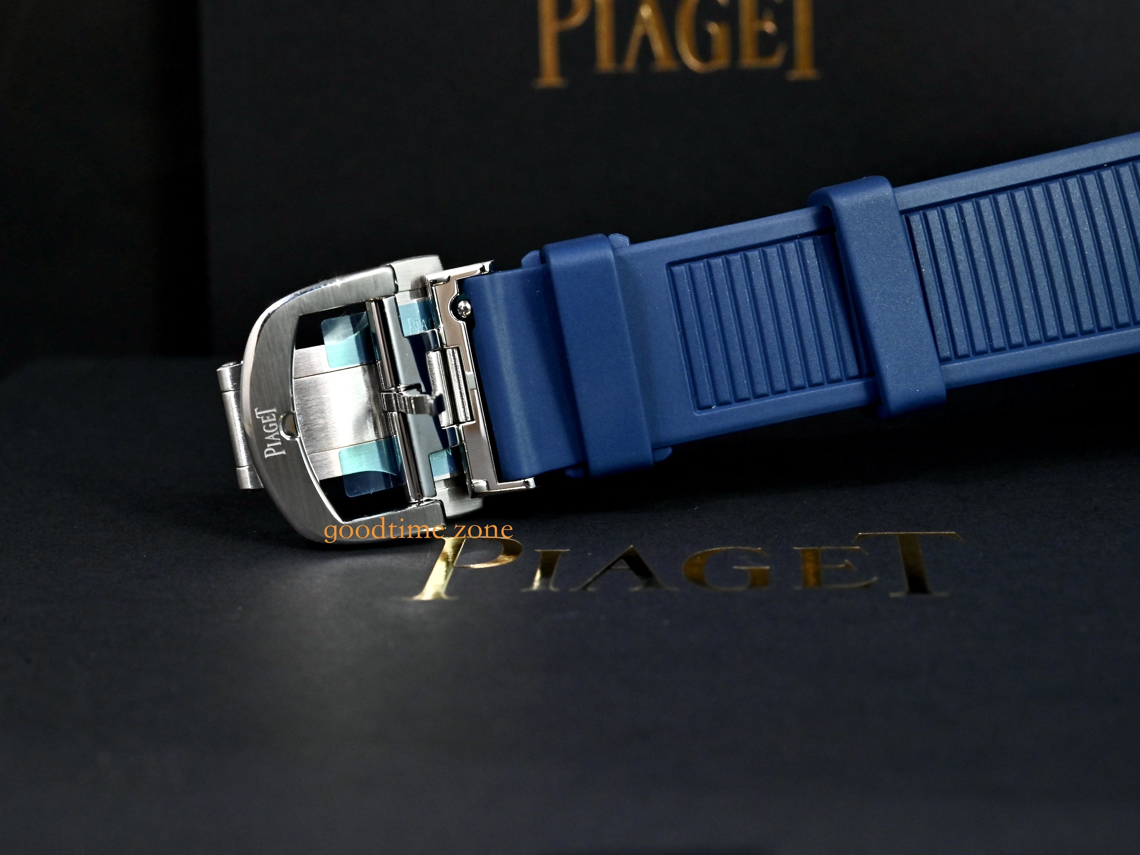 不鏽鋼材質、藍色橫條紋雕紋面盤、原廠藍色橡膠錶帶、透明錶背、自動盤鐫刻有伯爵品牌印記