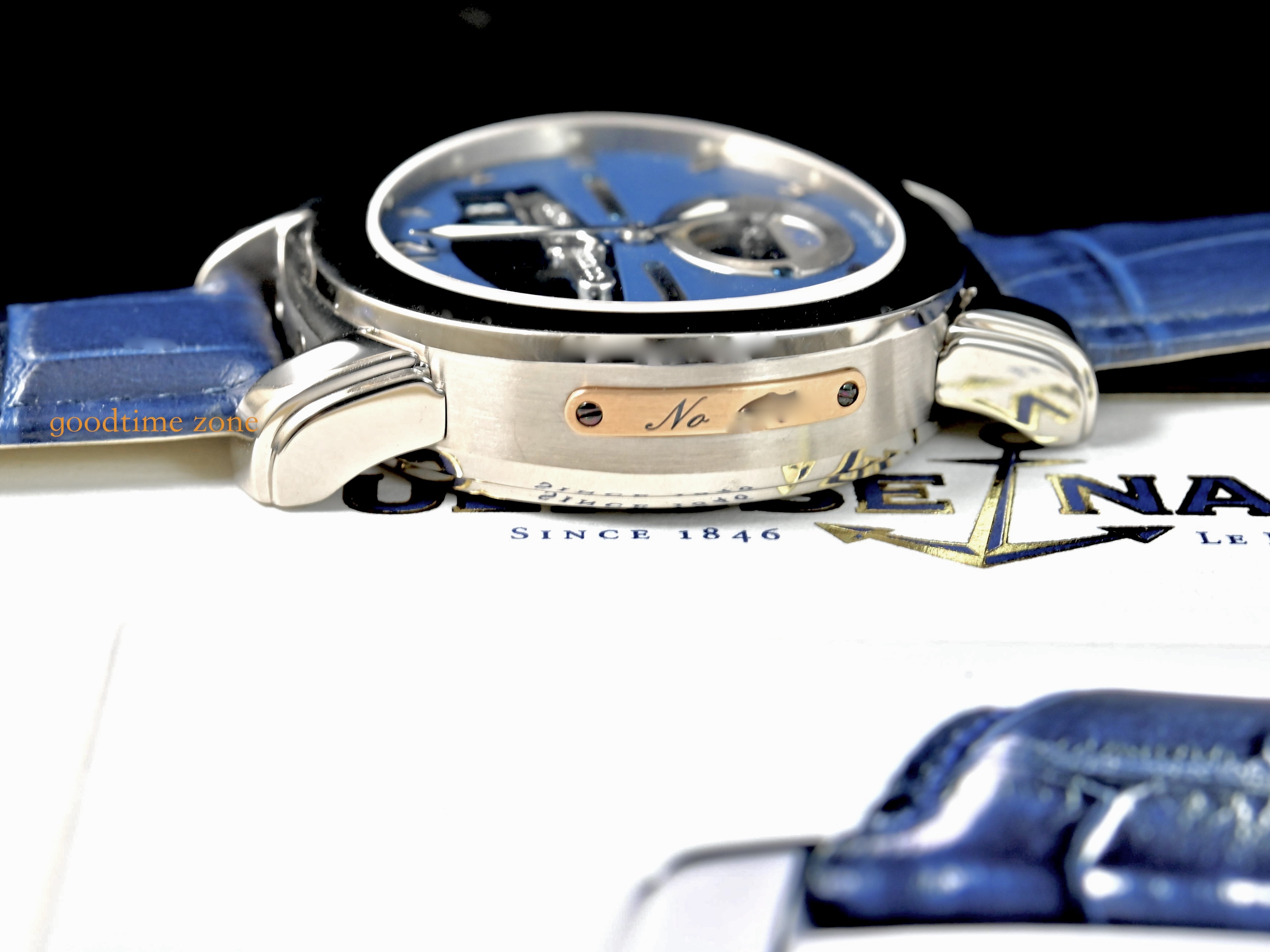 18K白金材質、藍色面盤、可雙向調校的大日期視窗、銀色時針 、透明錶背