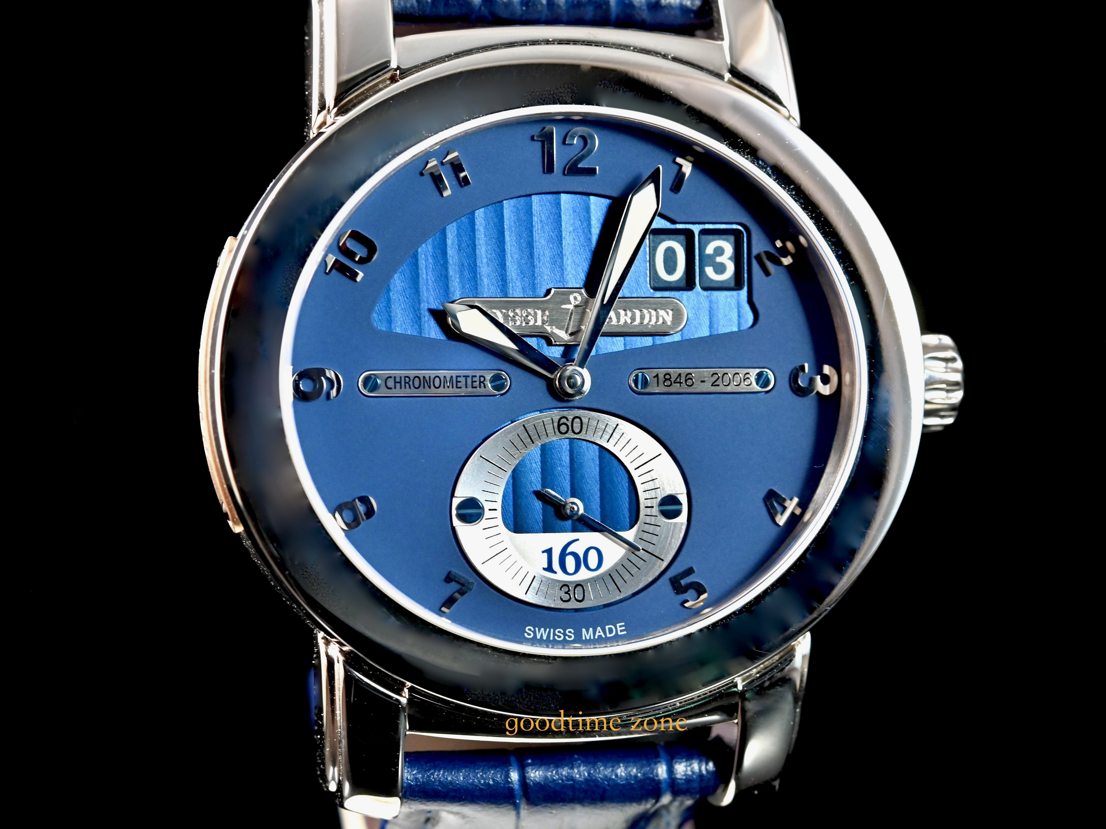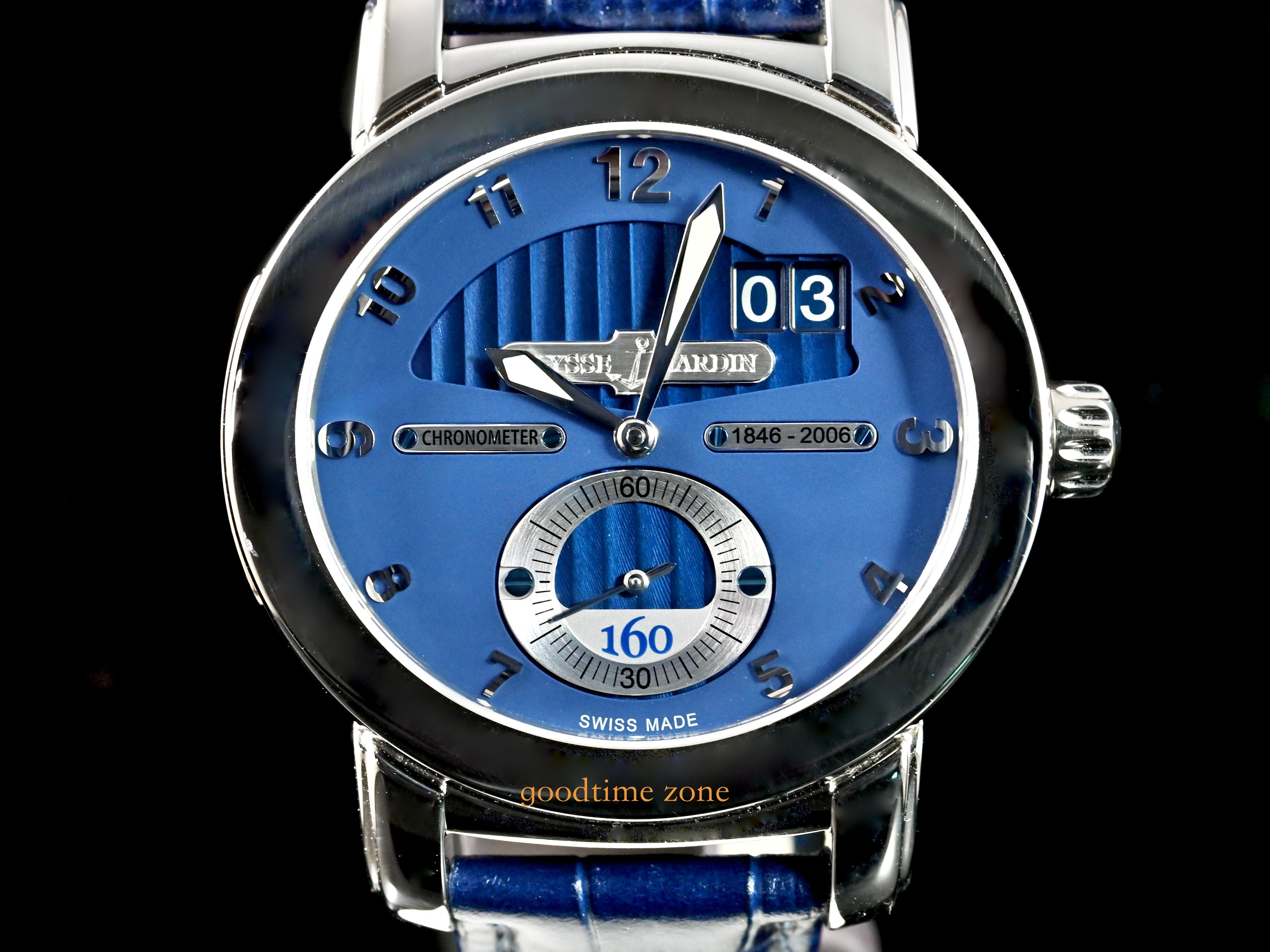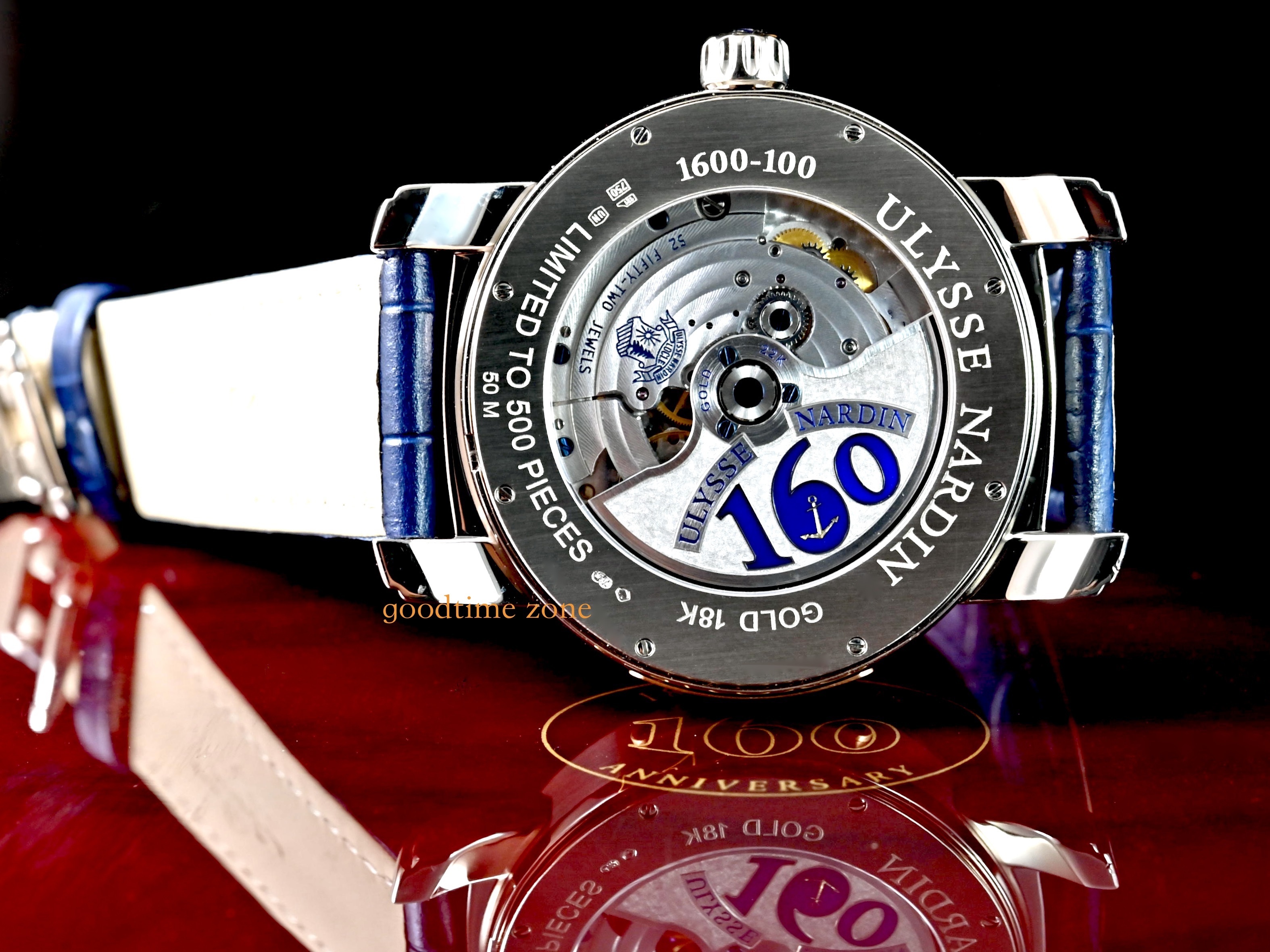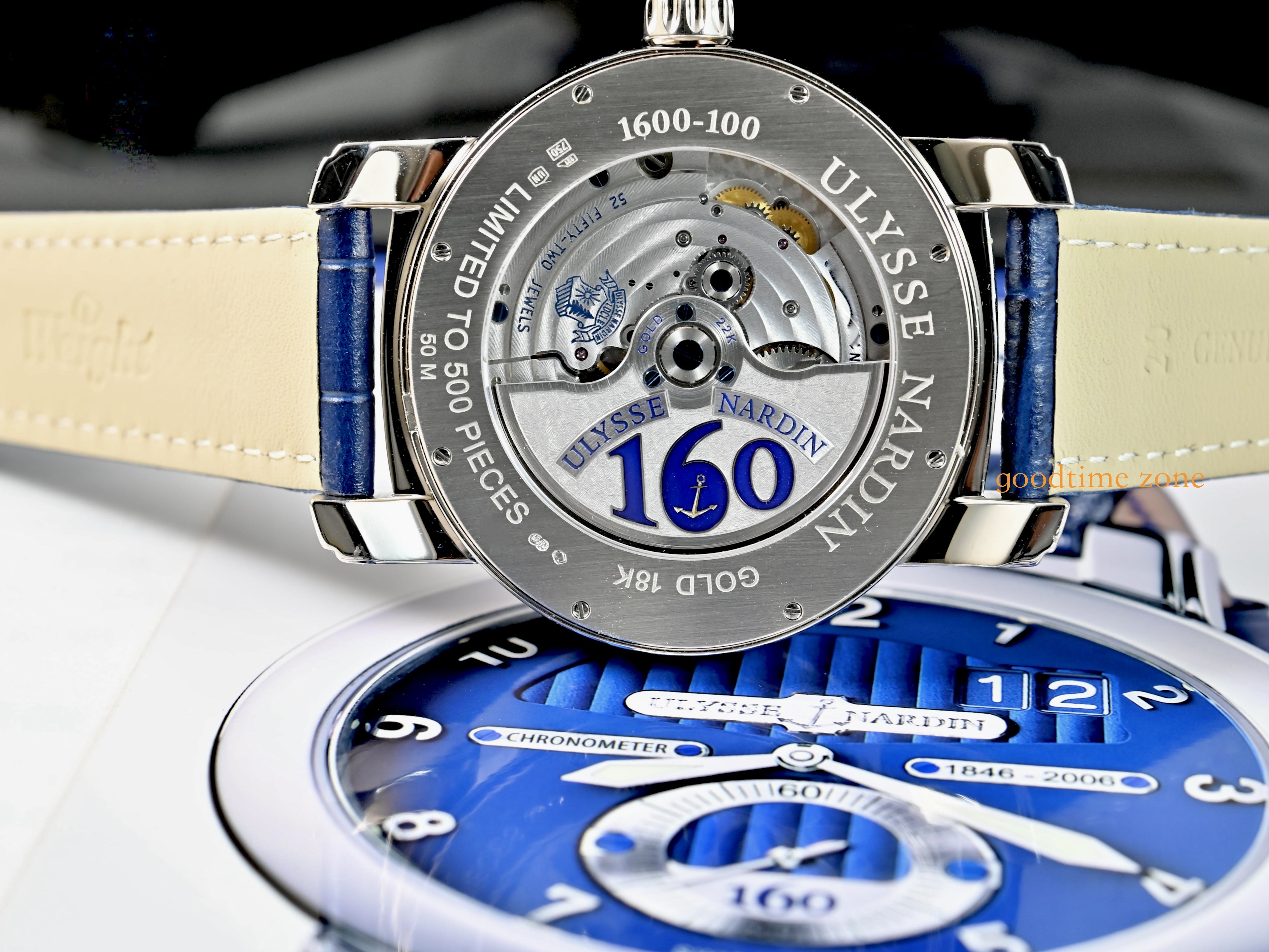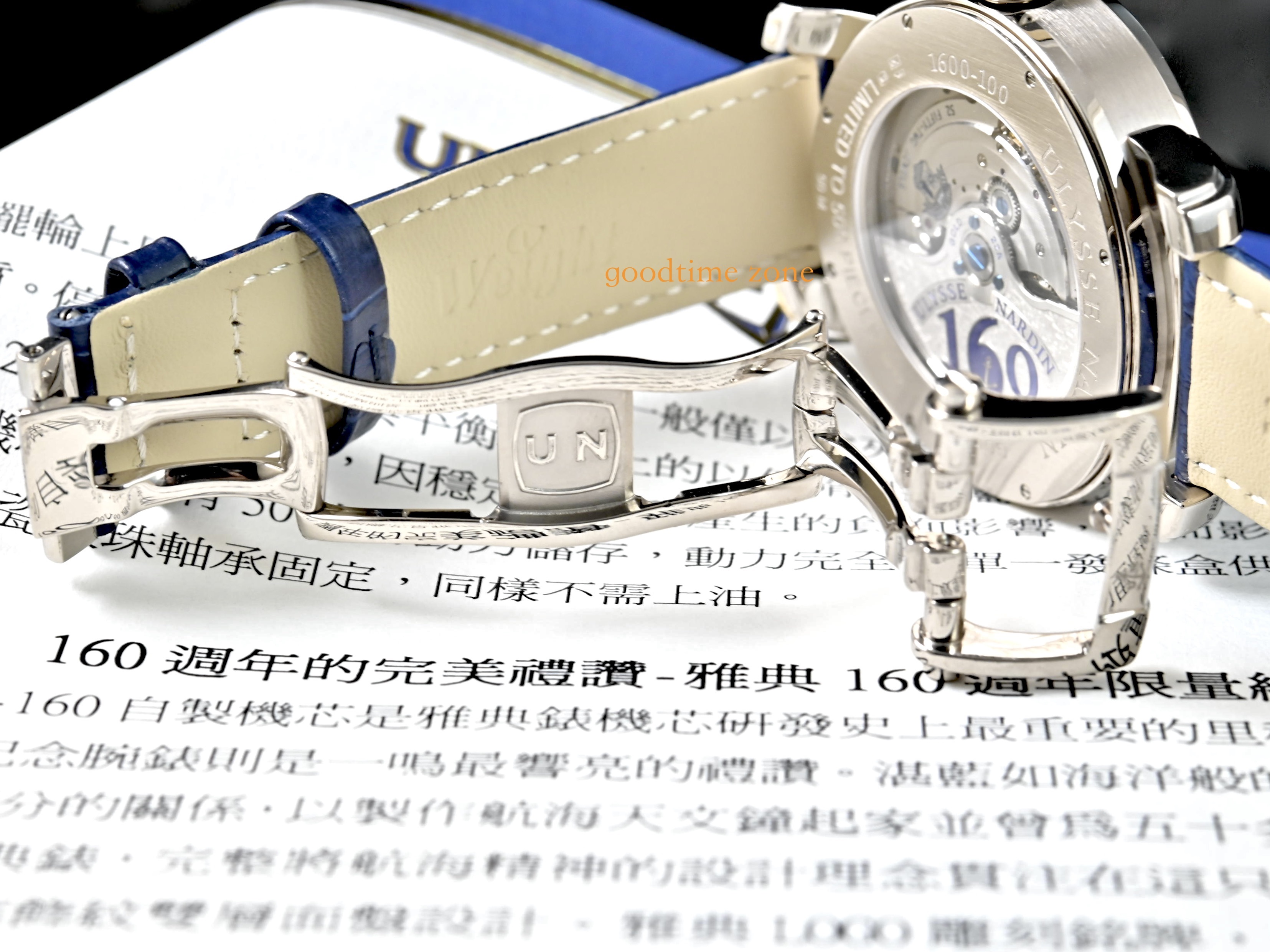 UN-160 自製機芯是雅典錶機芯研發史上最重要的哩程碑,而這枚160 週年限量紀念腕錶更是雅典錶的典範標誌,是性能與創新的完美結合。湛藍如海洋般的錶面,代表雅典錶與海洋深不可分的關係,以製作航海天文鐘起家並曾為五十多國海軍指定使用海上計時器的雅典錶,完整將航海精神的設計理念貫注在這枚週年紀念腕錶中。雅典 LOGO 雕刻銘牌,質感大幅提升,同時也在面盤上標示品牌創歷年份,後葢自動盤上更刻有 160 字樣,深具紀念意義