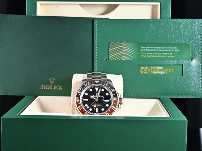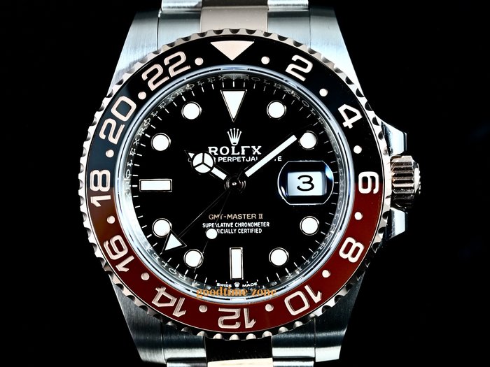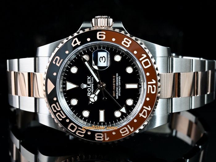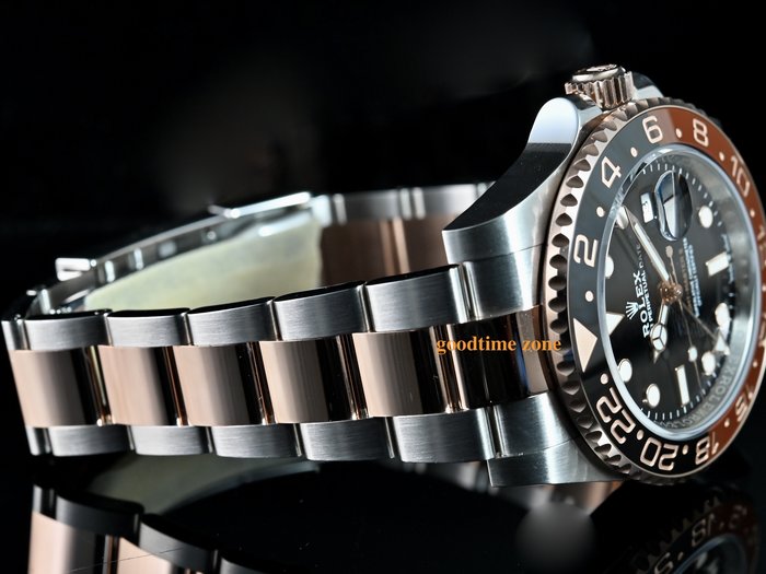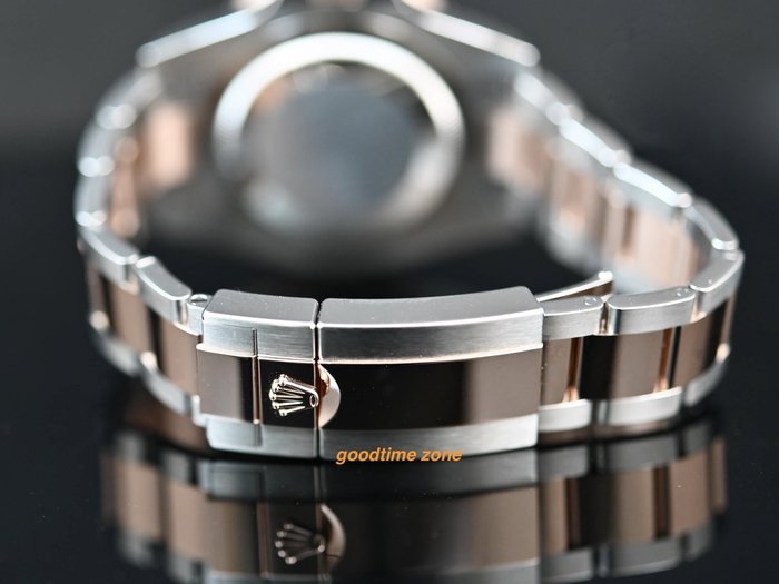 18K玫瑰半金材質、雙色(棕、黑)Cerachrom陶質字圈 、夜光賓士指針、時標、藍寶石水晶玻璃