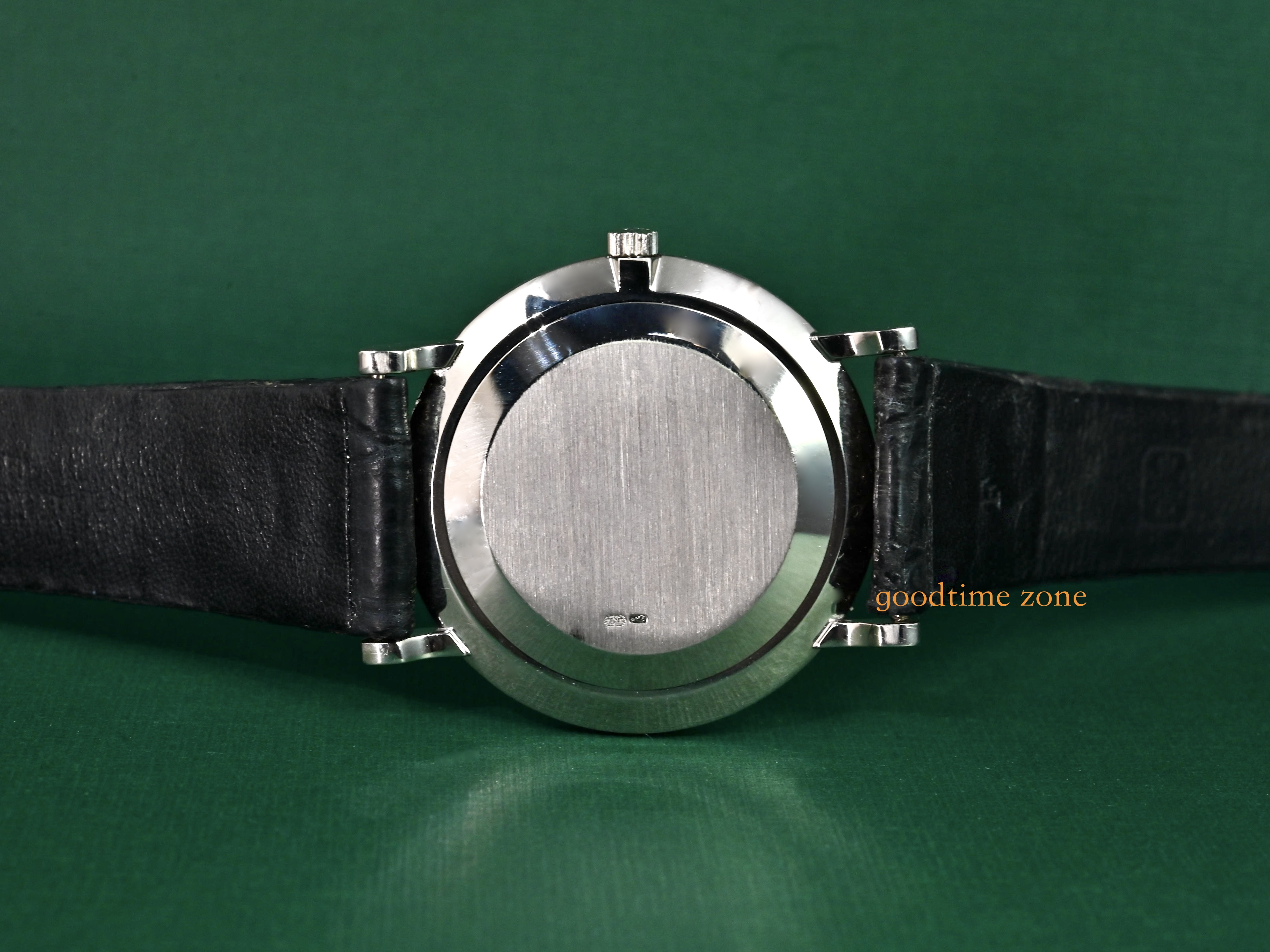 18白K金材質、銀白色面盤、立體刻度時標、弧型藍寶石水晶玻璃