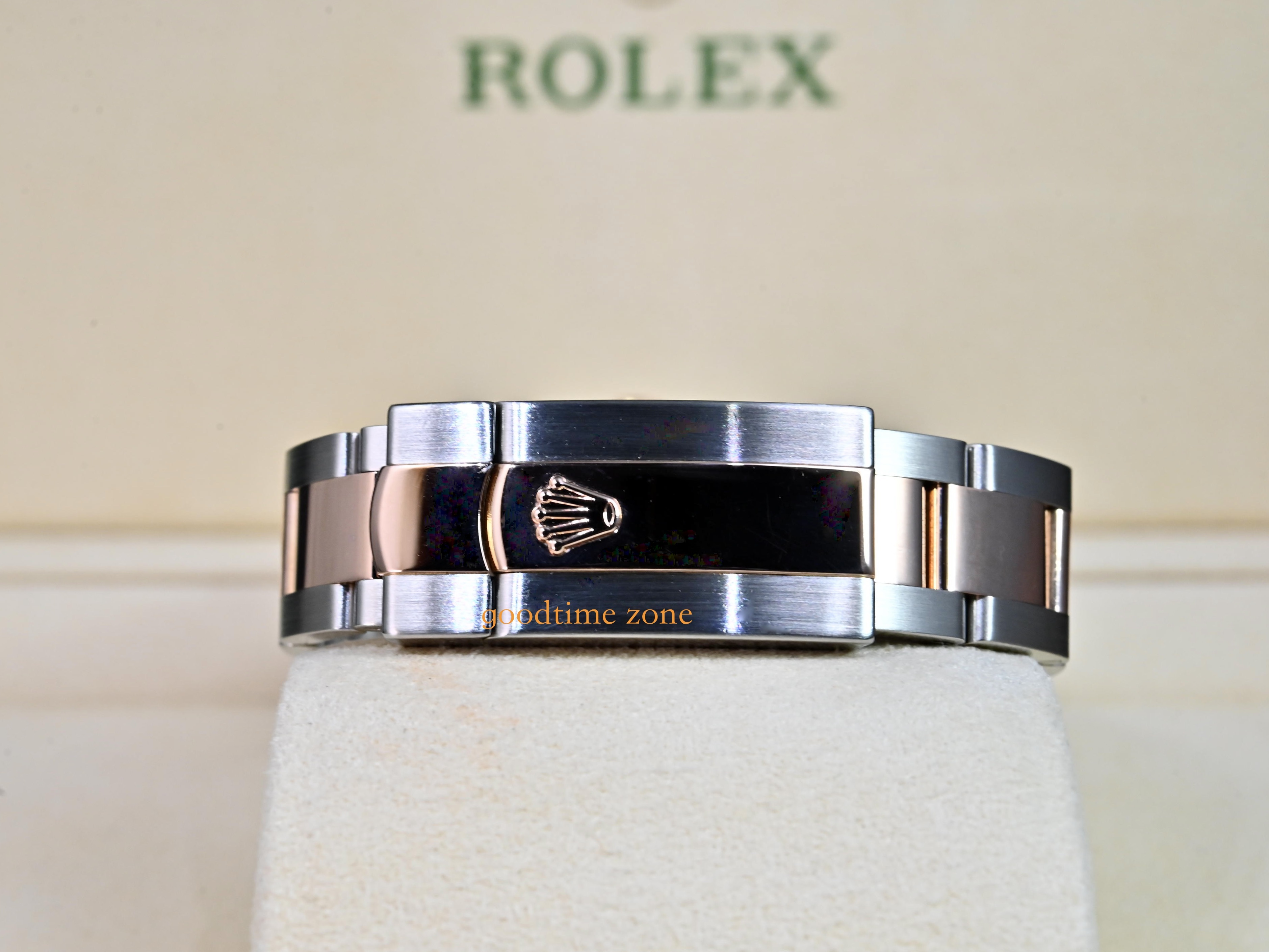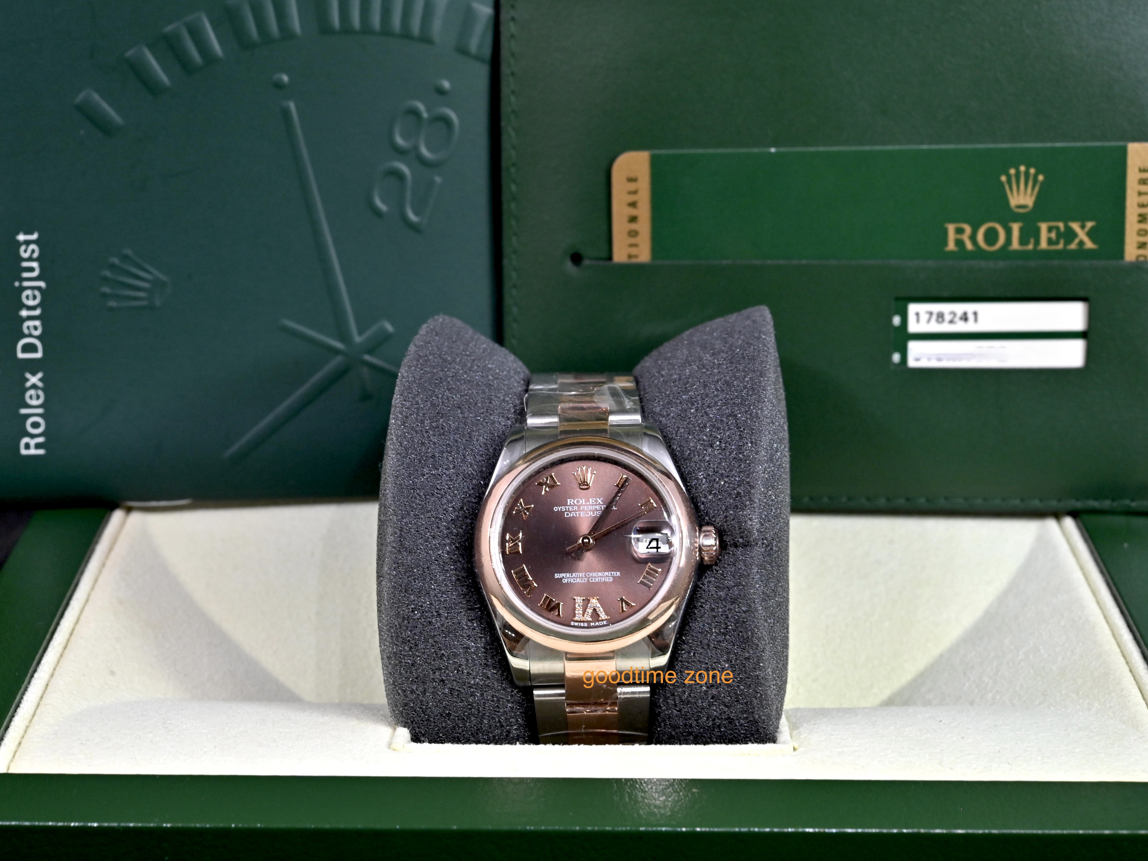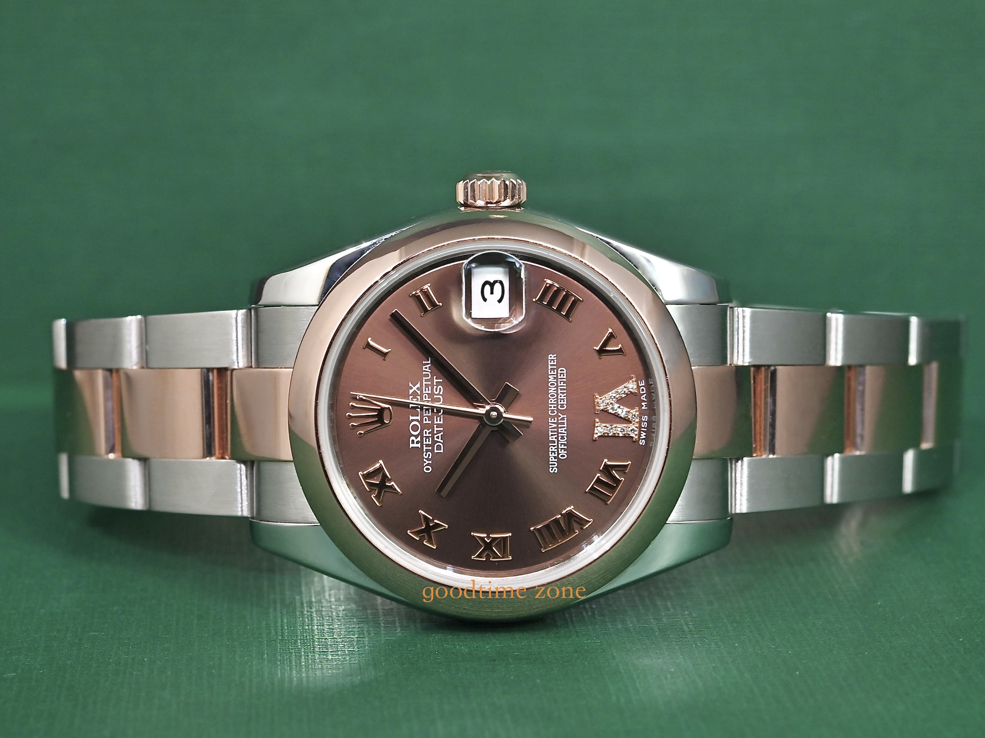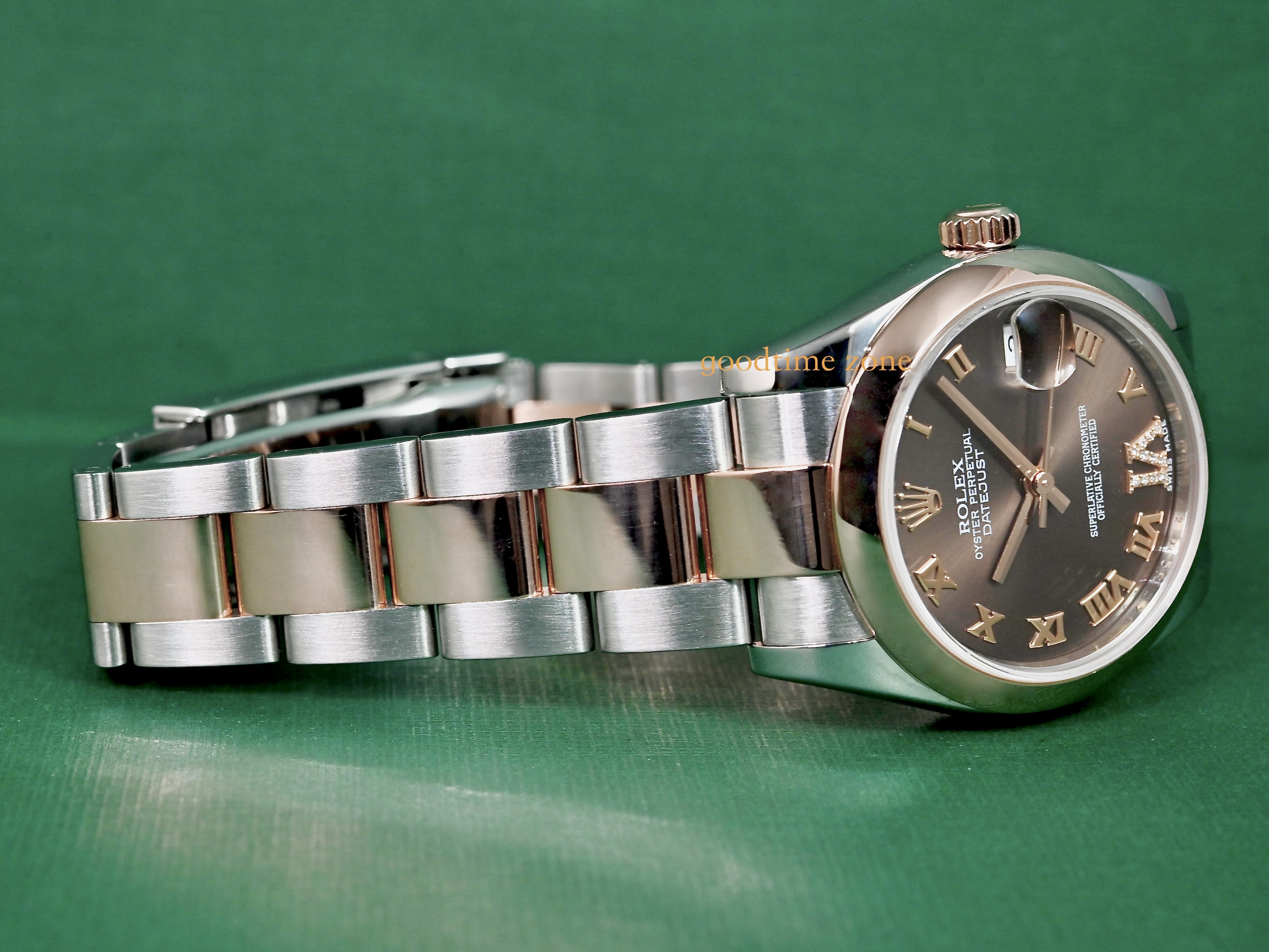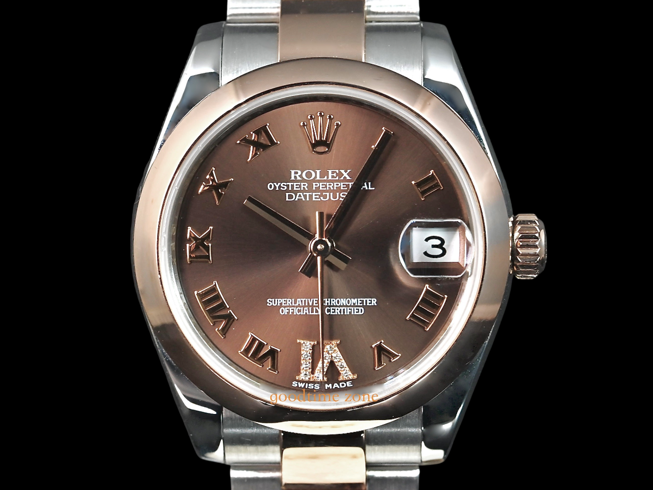 18K玫瑰半金+不鏽鋼材質、巧克力色面盤、玫瑰金指針及羅馬數字時標、原鑲鑽石羅馬數字VI時標
