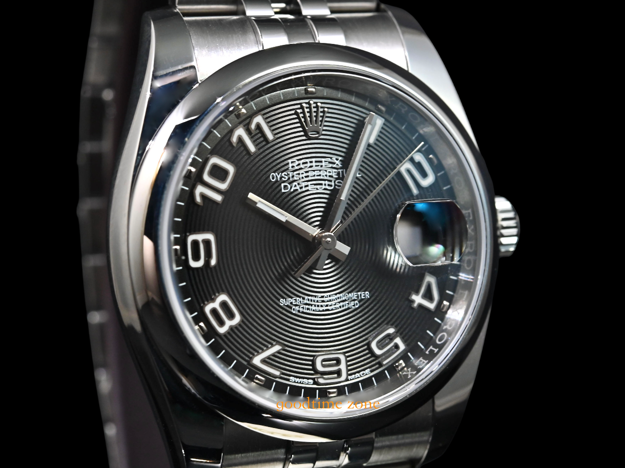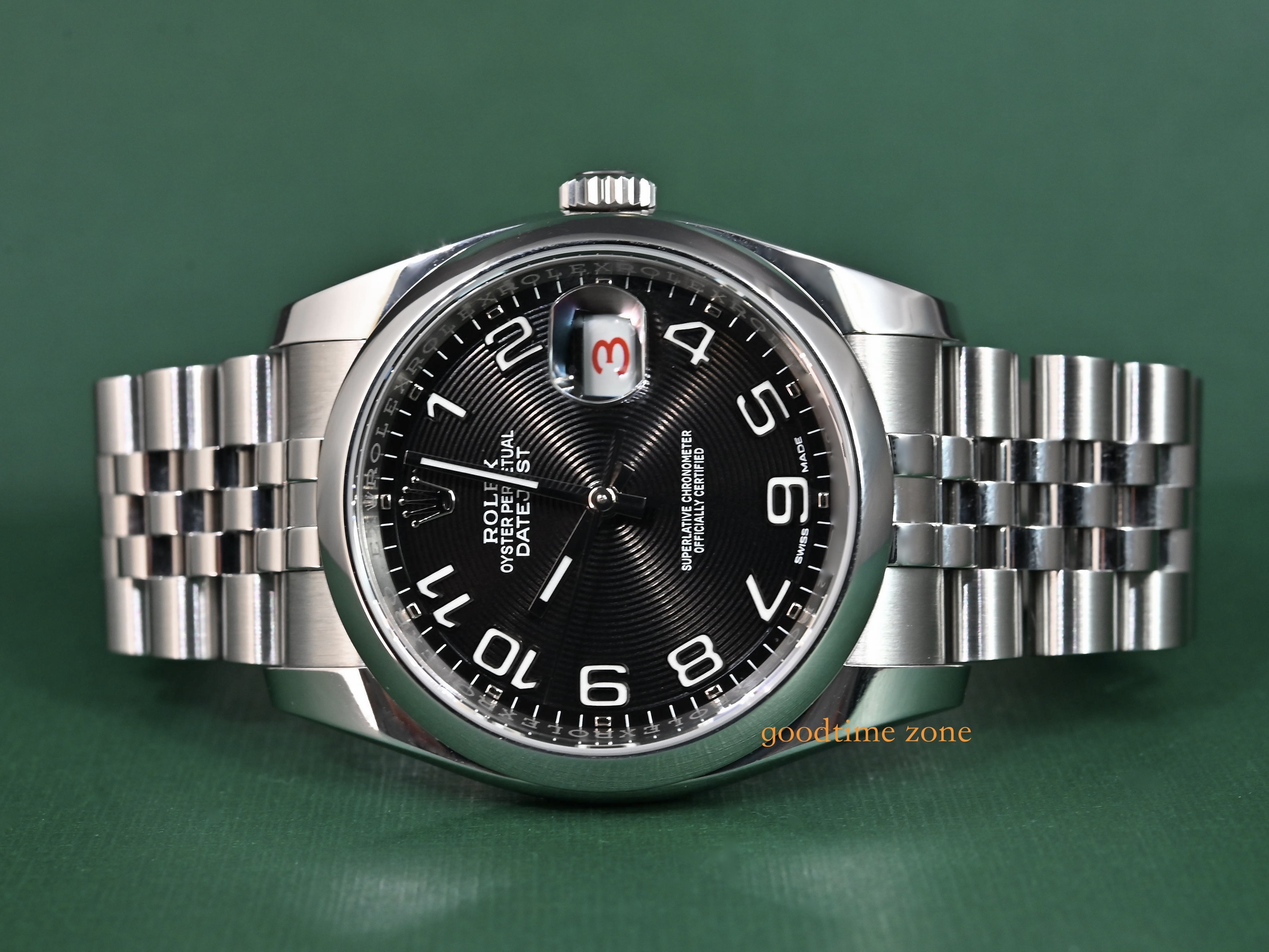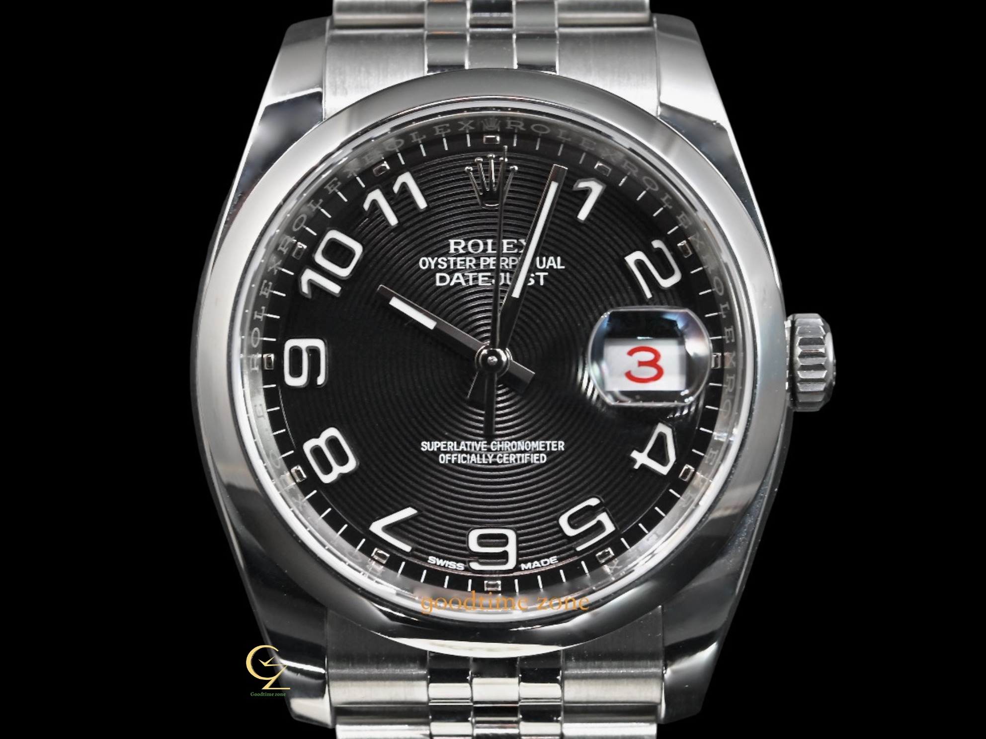 不鏽鋼材質、原裝黑色同心圓數字面、藍寶石水晶玻璃