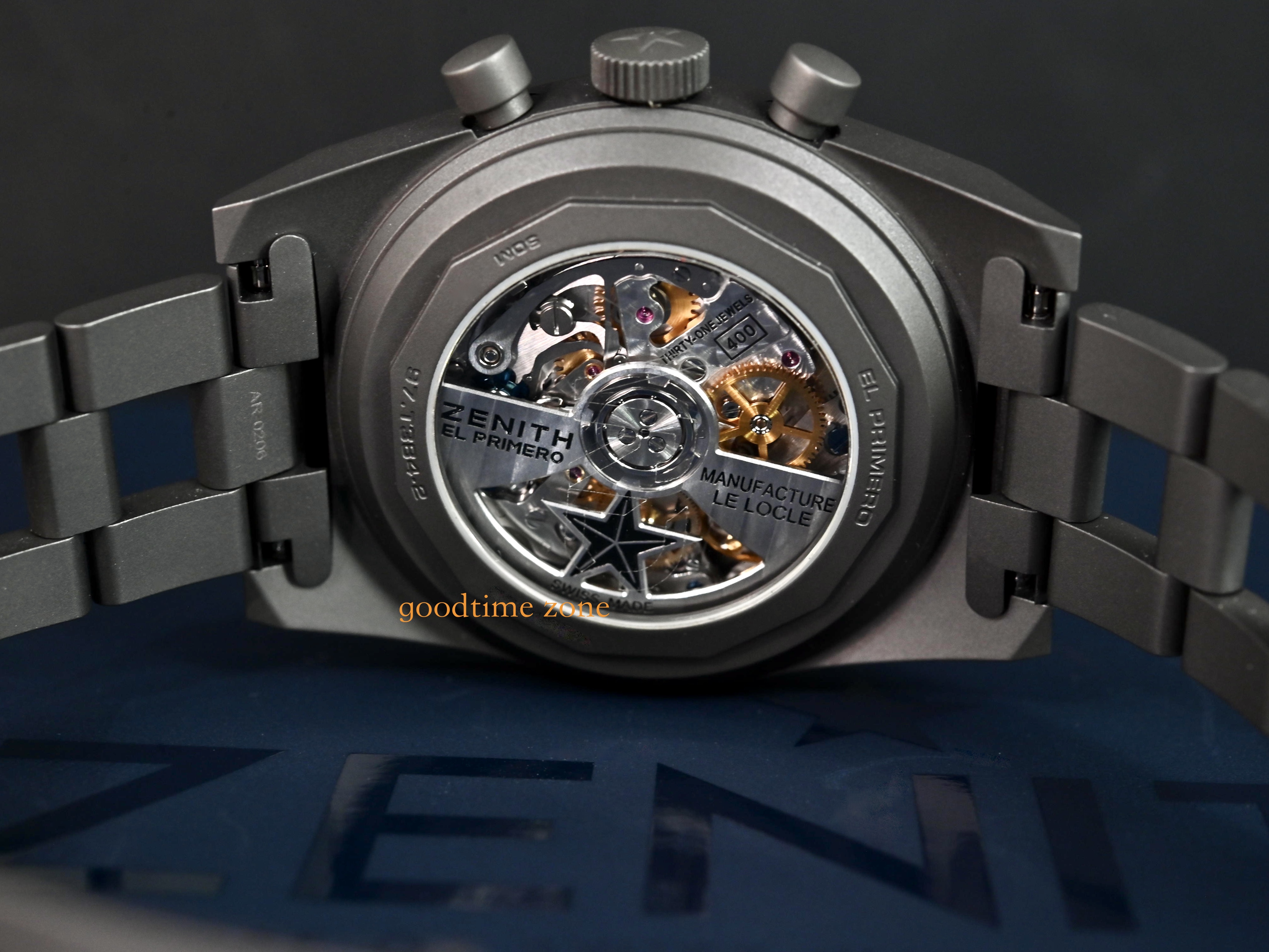 Cal.El Primero 400自動上鍊機芯、時,分針,小秒針指示、60秒、30分鐘12小時計時碼表功能、日期窗顯示、動能儲存50小時、防水50米
