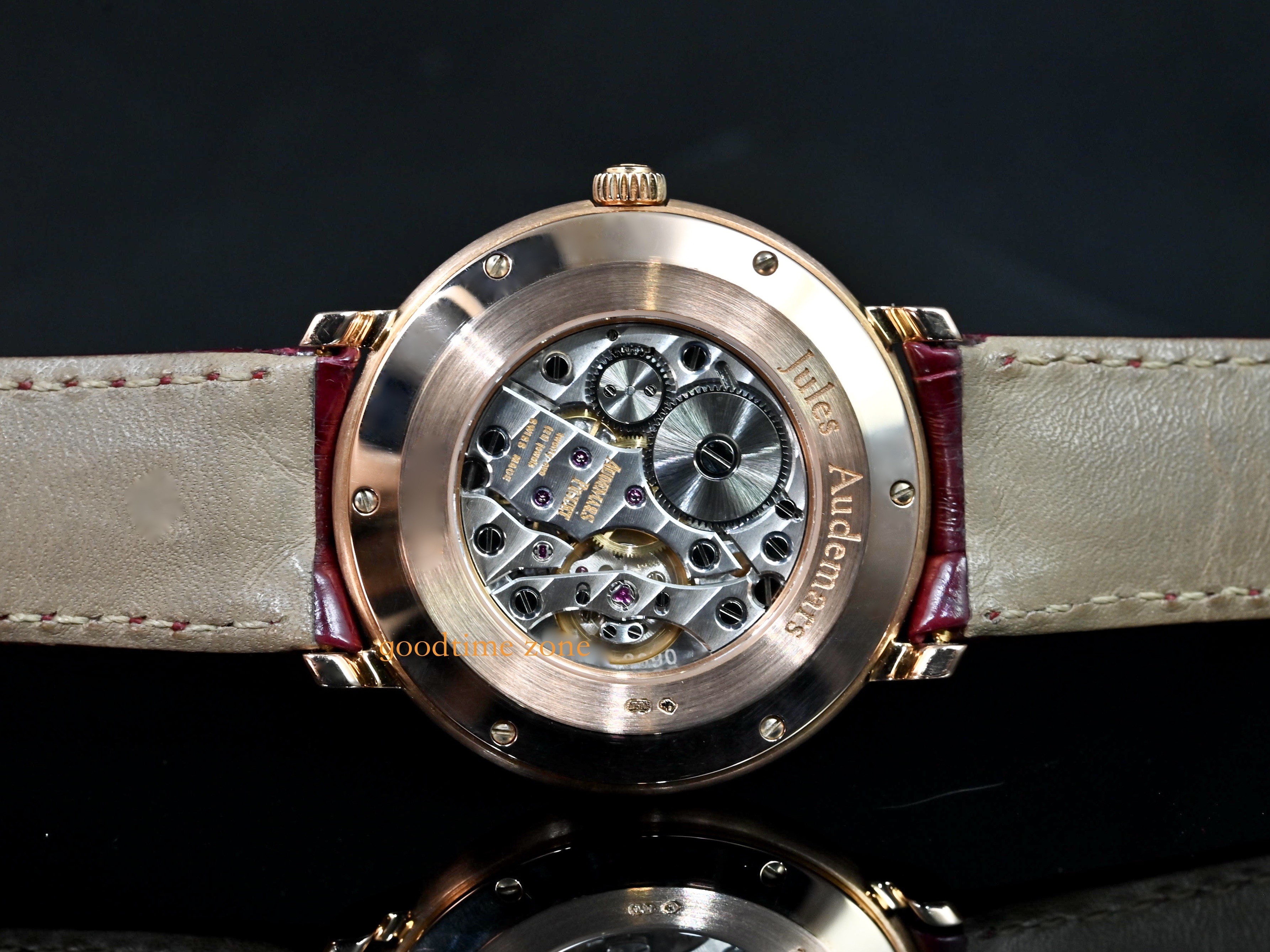 18K玫瑰金材質、銀色面盤、18K玫瑰金羅馬數字時標、透明錶背、藍寶石水晶玻璃