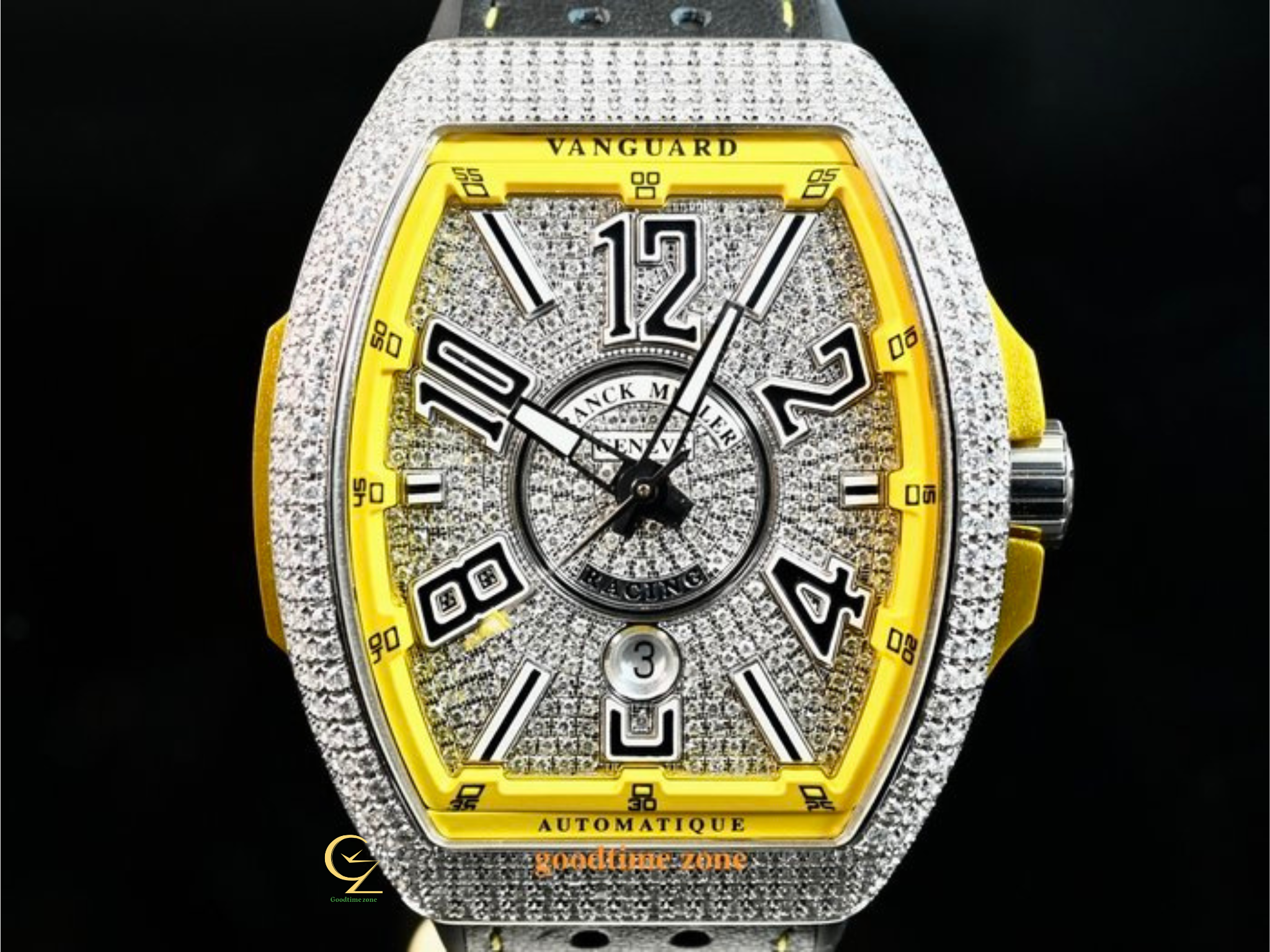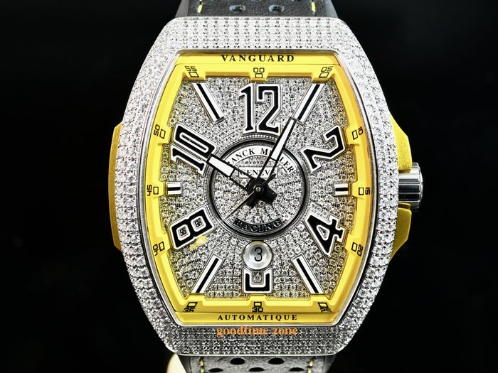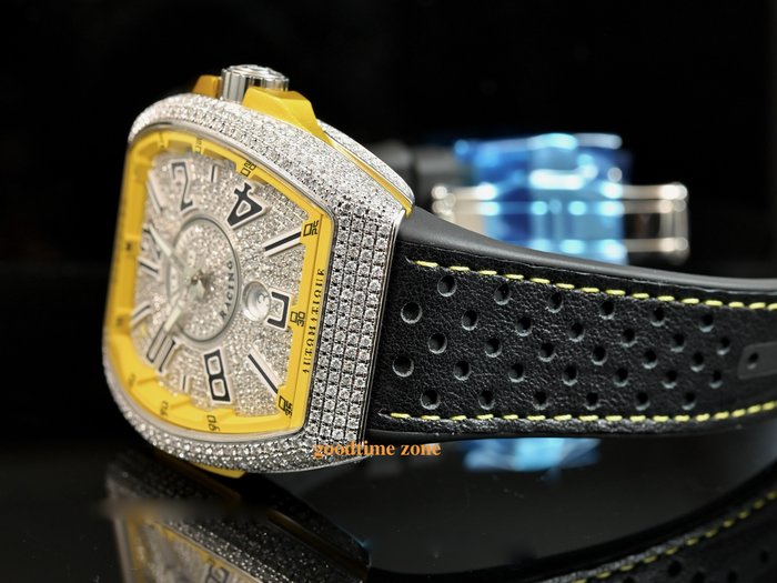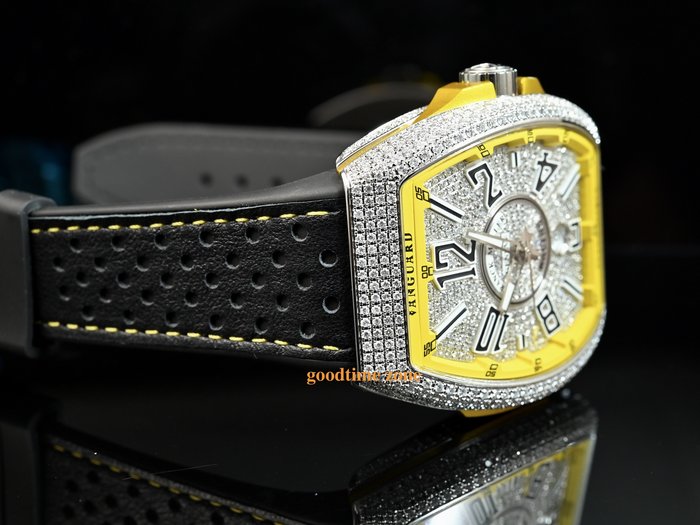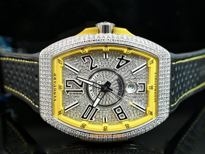不鏽鋼材質、 精鑲鑽圈、黃框精鑲鑚面、 藍寶石水晶玻璃