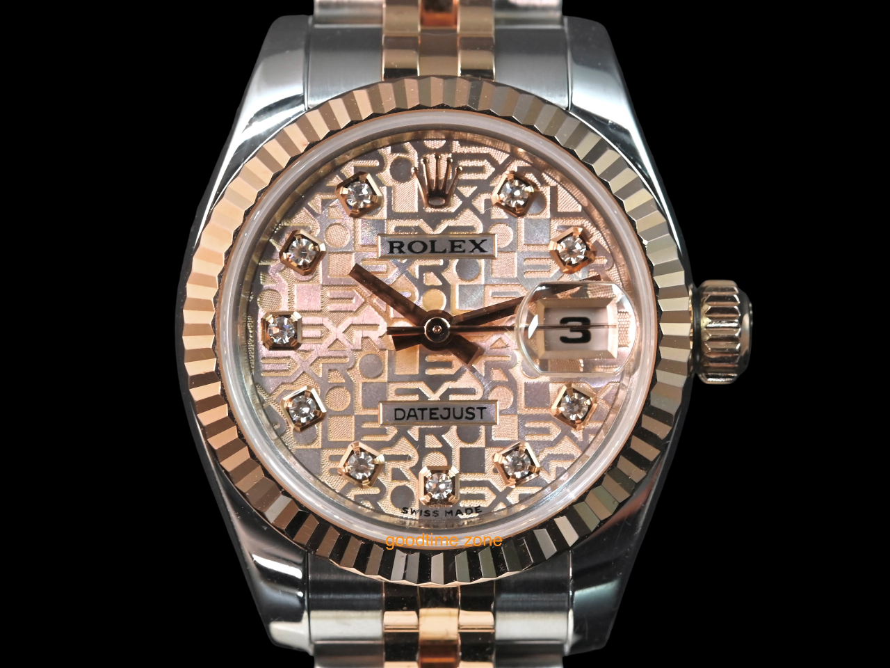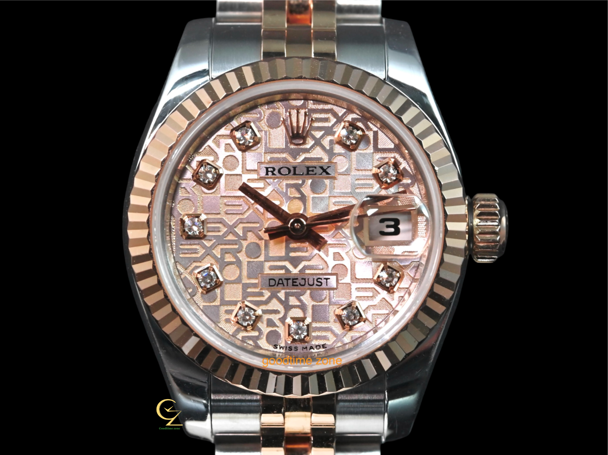 18K玫瑰金搭配不鏽鋼材質錶殼、原裝粉紅包台紀念面、玫瑰金指針