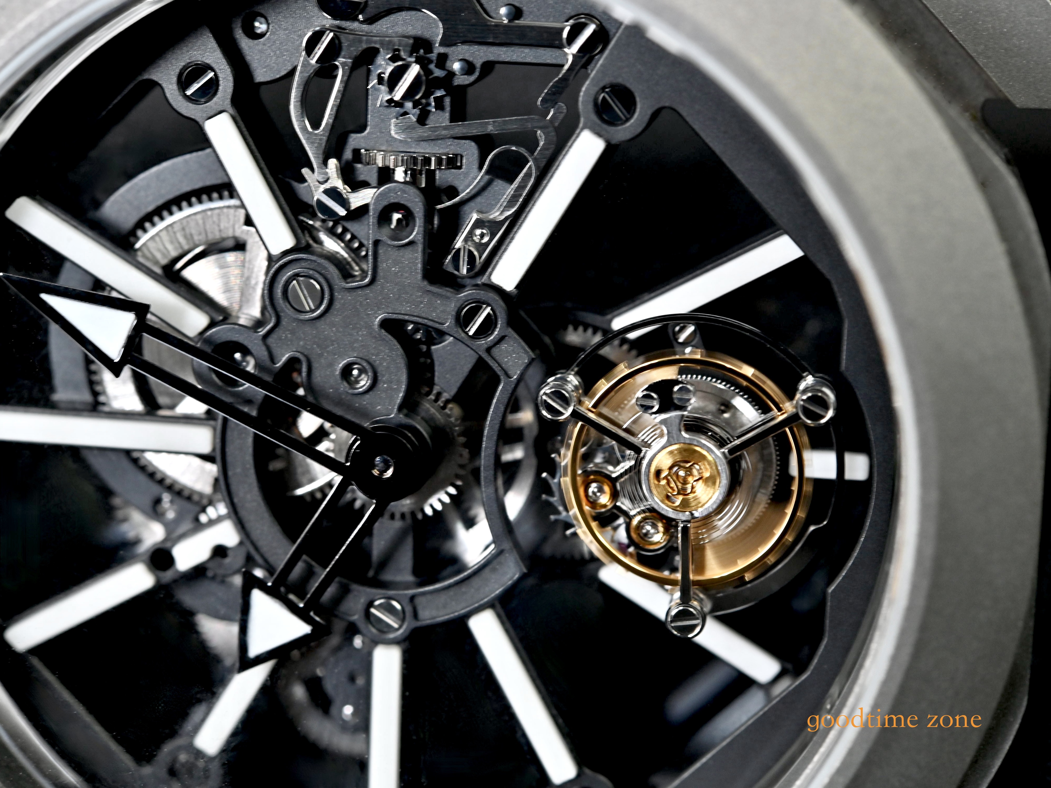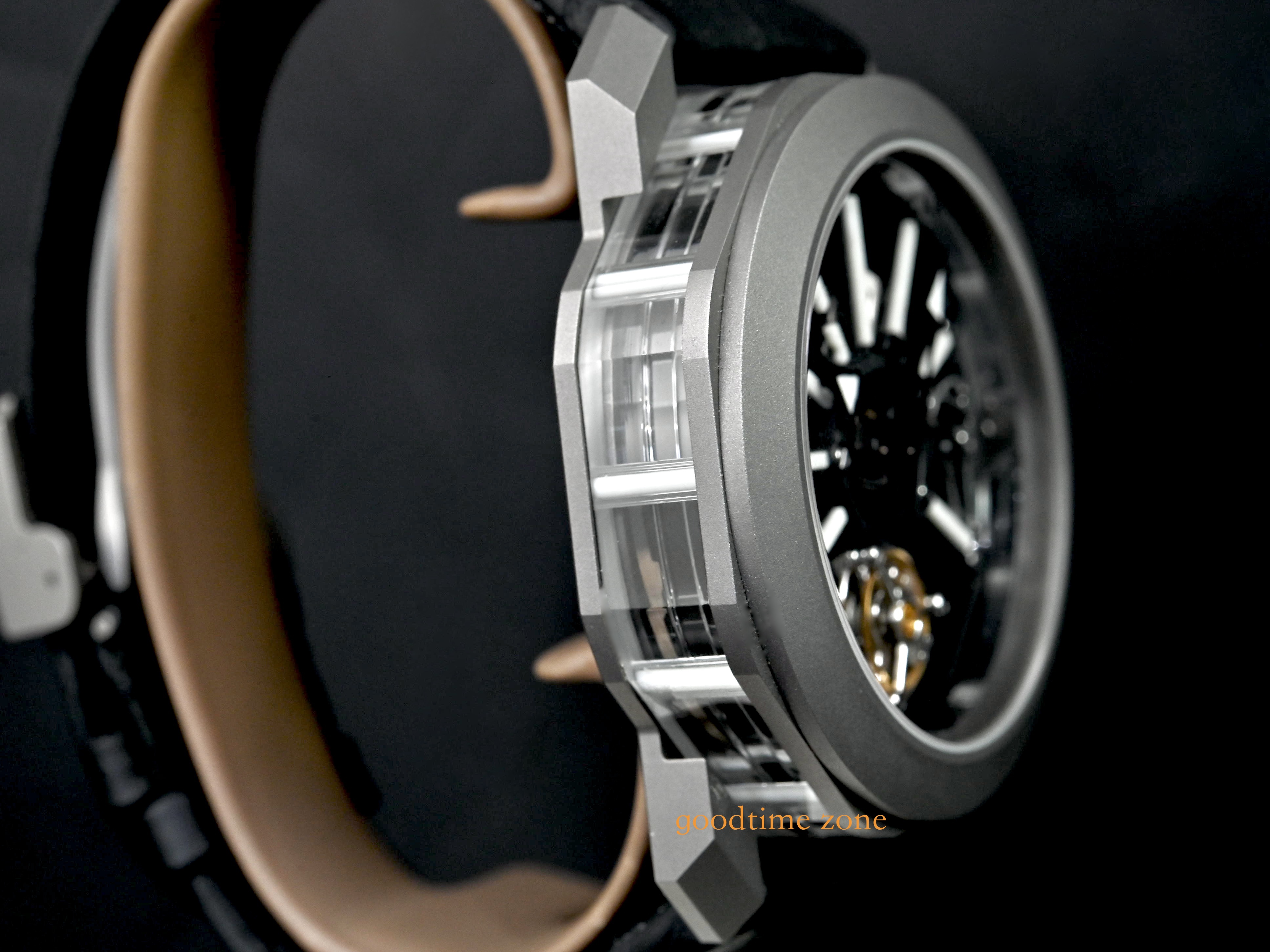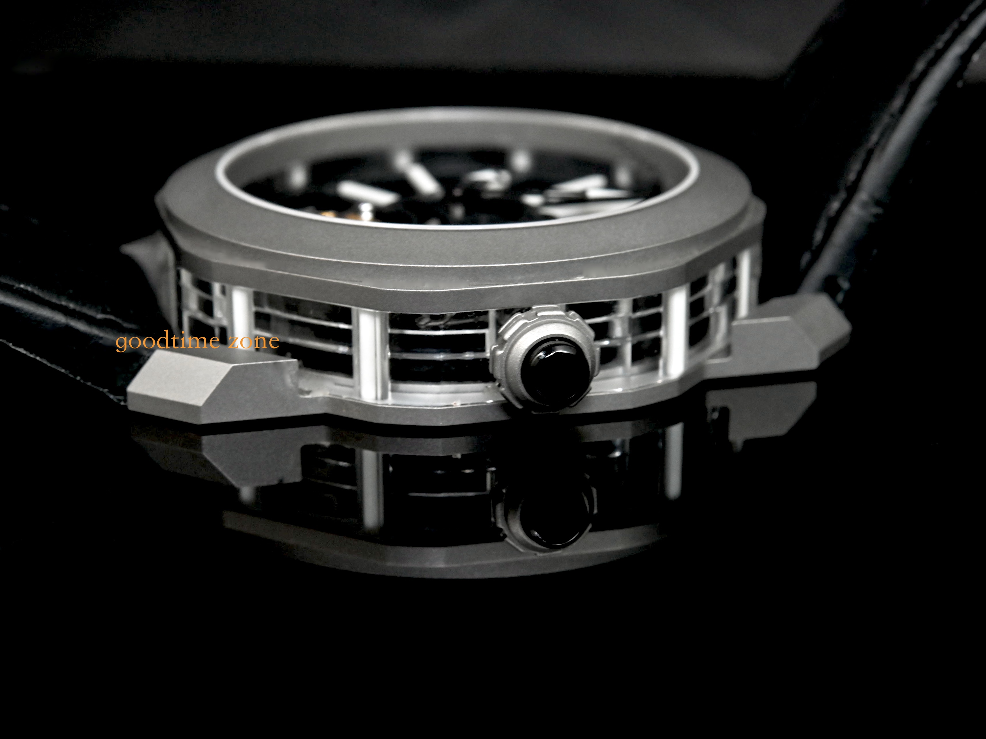 鈦金屬材質、 鏤空面盤、 藍寶石水晶玻璃鏡面