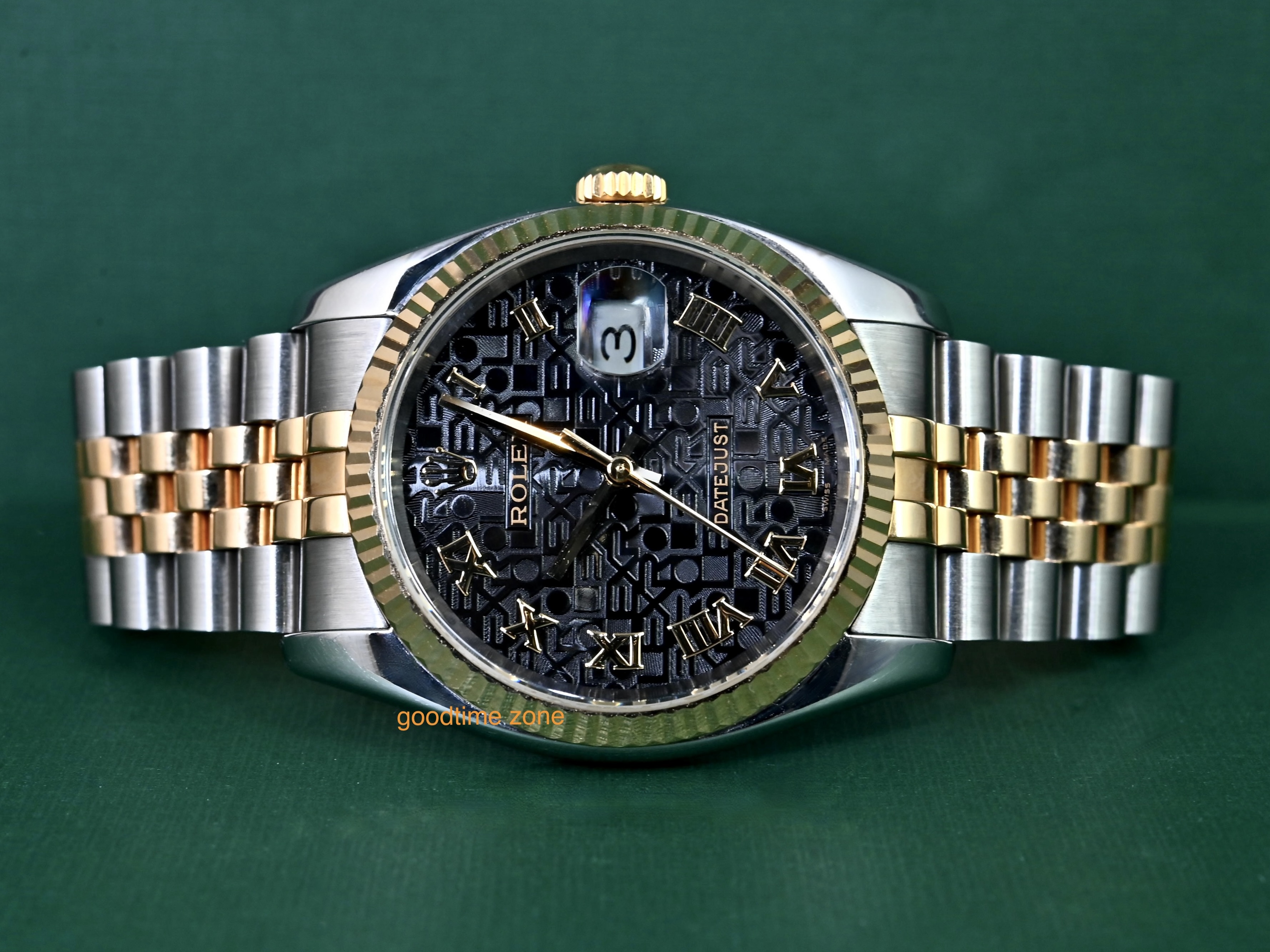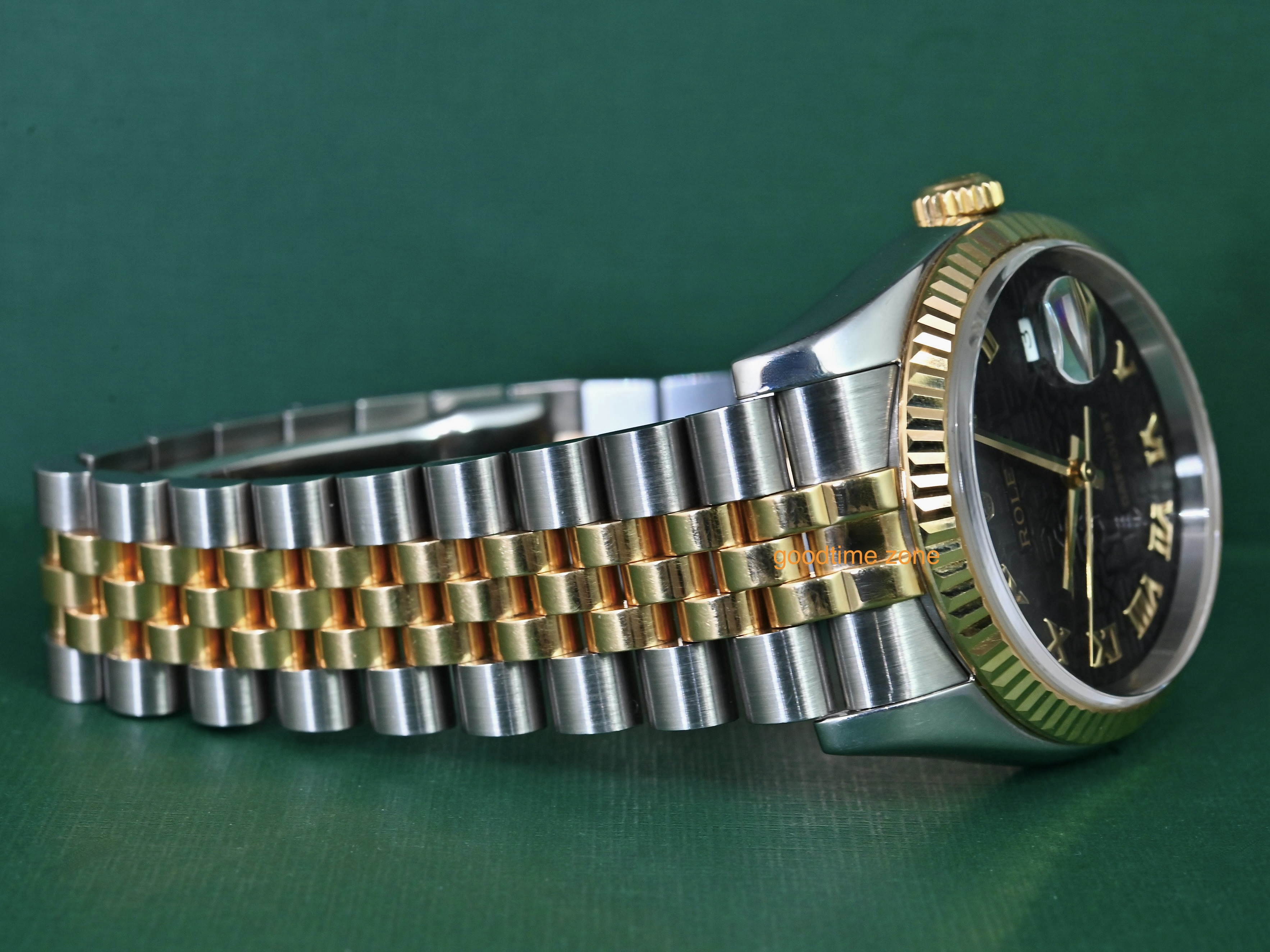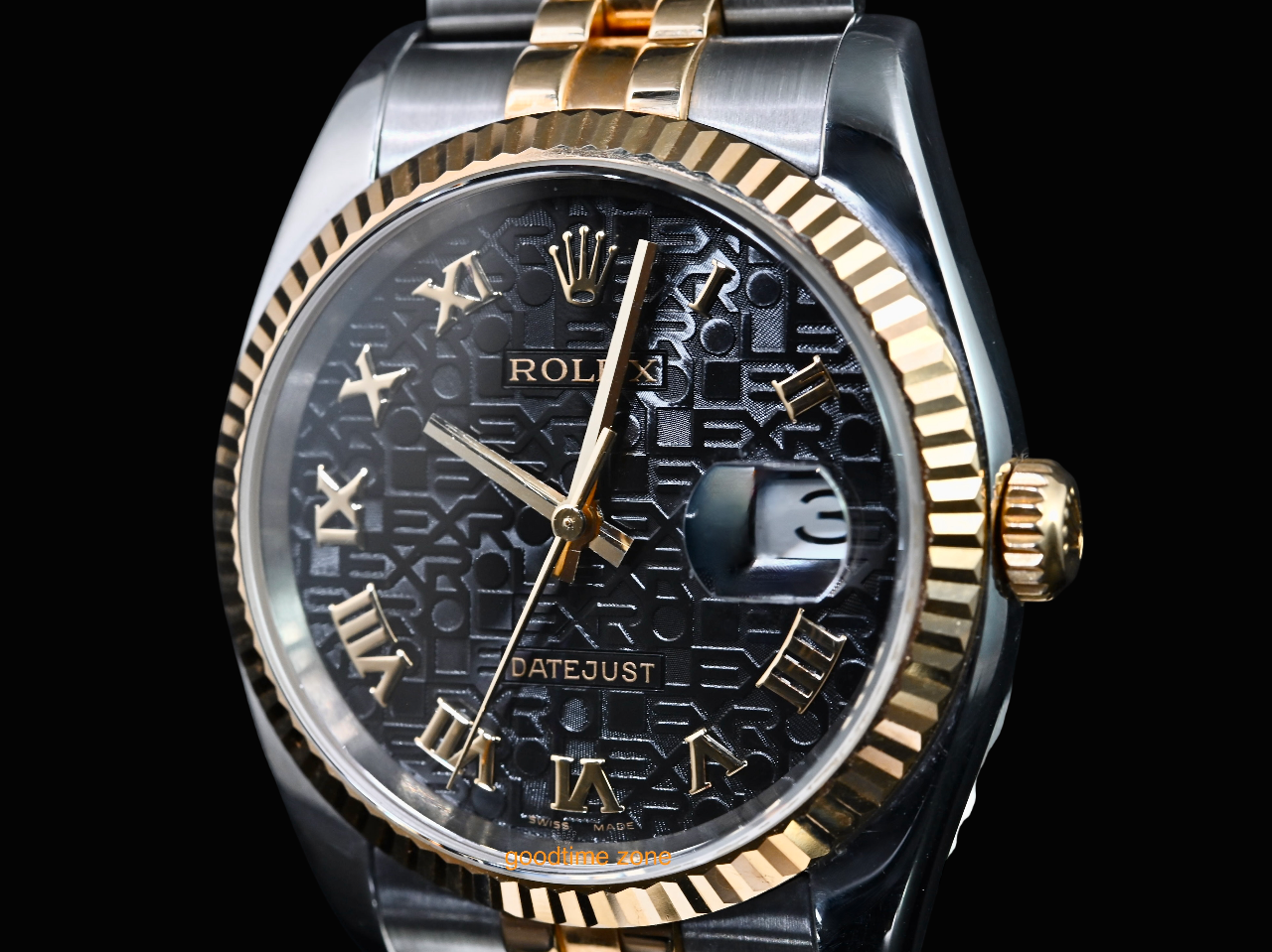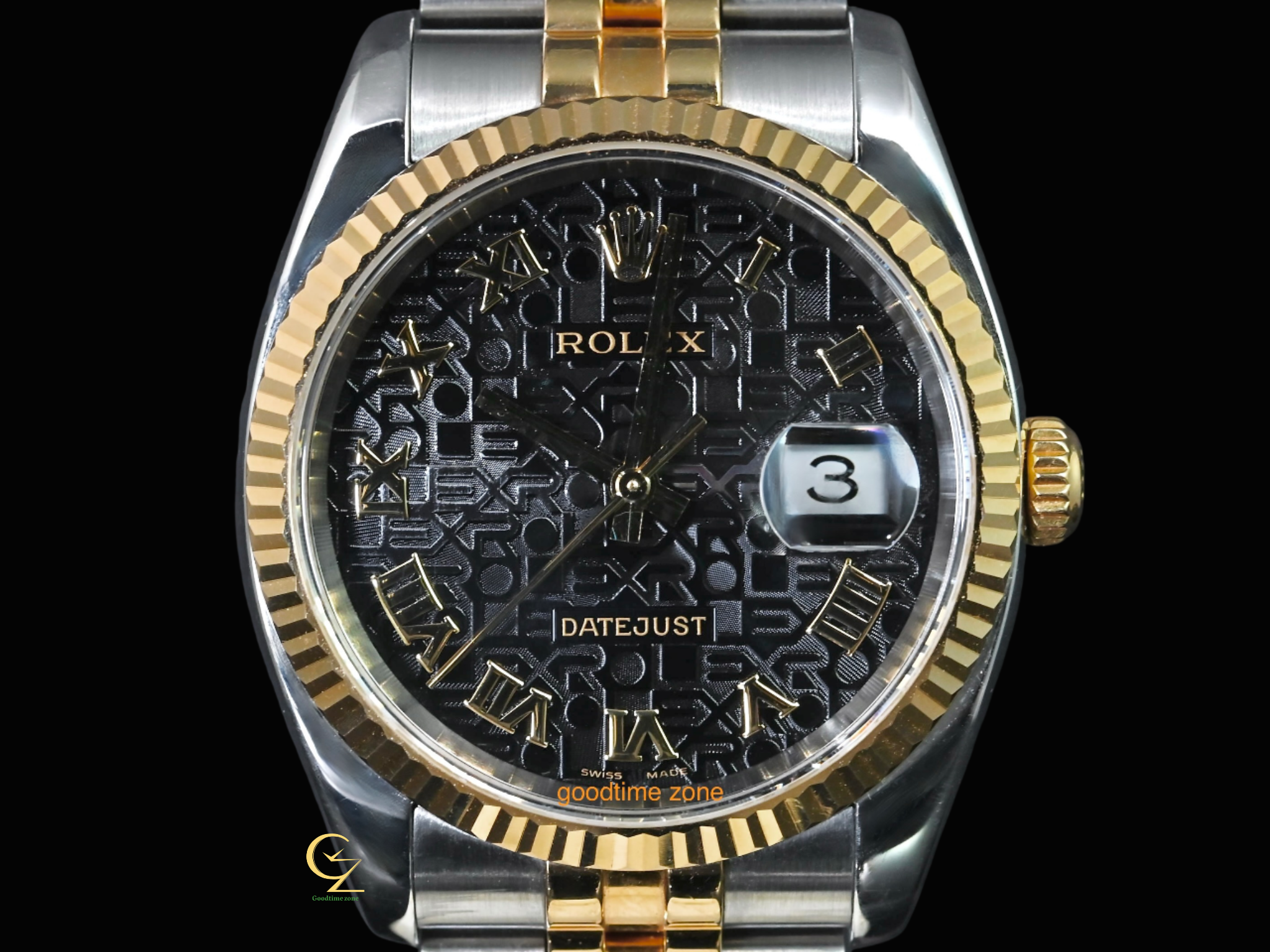 18黃K金+不鏽鋼材質、原裝黑色羅馬字紀念面盤 、藍寶石水晶玻璃