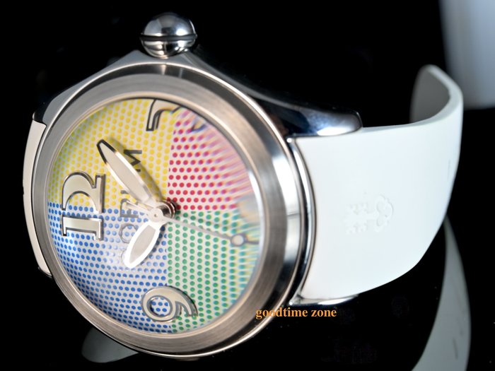 不鏽鋼材質、原廠白色膠錶帶、四色面盤( 紅,黃,綠,藍)、藍寶石水晶玻璃