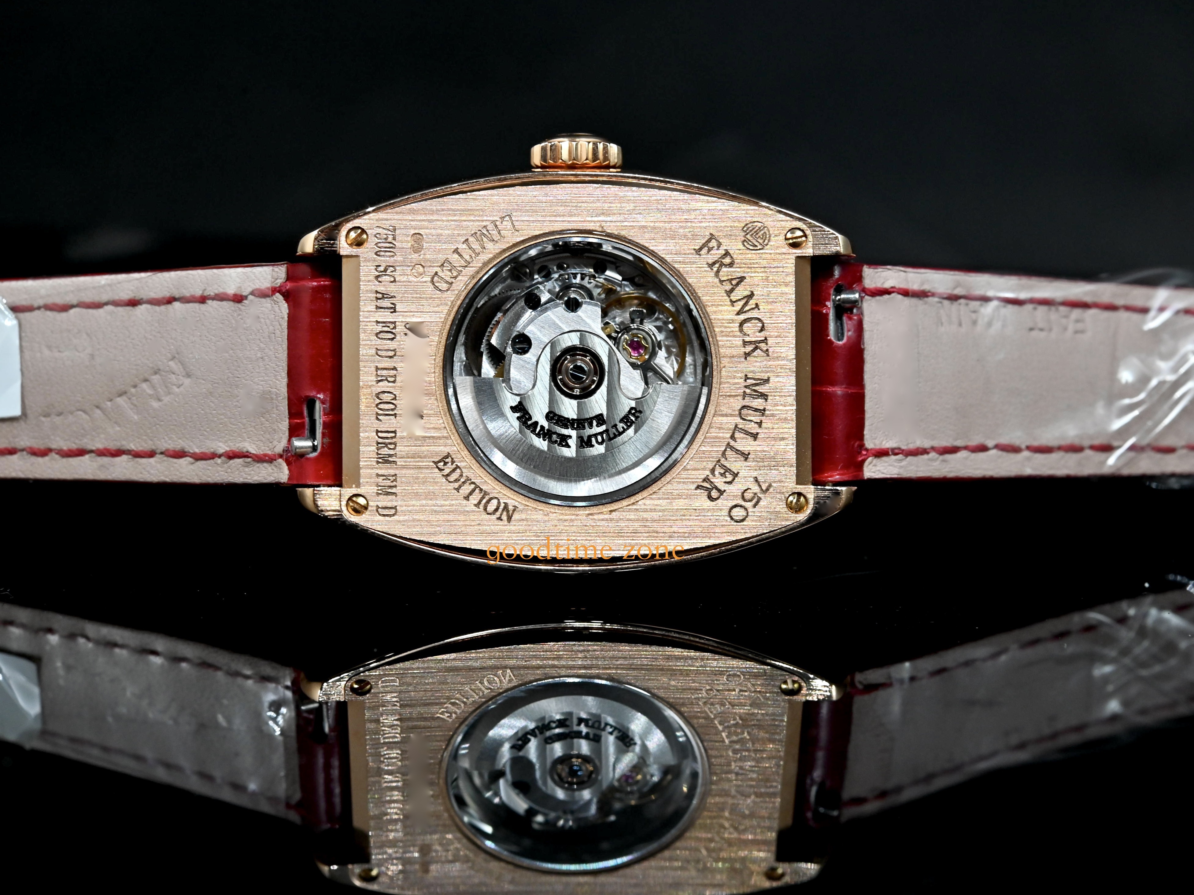 18K玫瑰金材質、原鑲鑽圈、彩色數字面盤、藍寶石水晶玻璃、透明底蓋